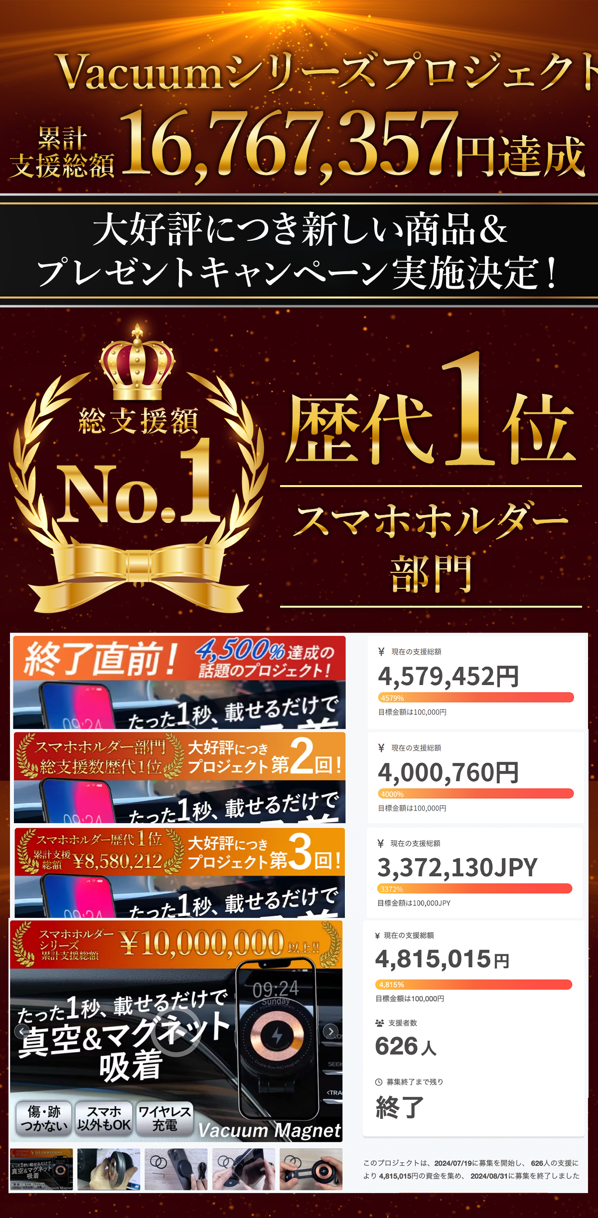 2026/04/03 21:00\Vacuum Magnet紹介/こんばんは、BRIGHT DIYです。今回は皆さまに「真空吸着で強力固定、ワイヤレス充電対応、コンパクトで持ち運びも便利、スマホやタブレットの使い勝手が向上する」プロジェクトを紹介させて頂きます。プレビューページをお気に入り登録して公開をお待ちください! 固定したままワイヤレス充電OK!真空&磁気吸着式折りたたみスマホホルダー最大割引は41%OFF!高割引率は数量限定です!ここだけの限定割引を見逃さないよう、ぜひお気に入り登録して公開をお待ちください!お気に入り登録することで公開されたらメールでお知らせいたします!プレビューページはこちら >>> https://camp-fire.jp/projects/911828/view※早期リターンは在庫がなくなり次第終了となります。大人気で終了したVacuumシリーズ最新作が登場!プレゼントキャンペーン付きプロジェクトを実施します!外れにくいのに、取り外すときは超簡単ワンボタン!プレビューページはこちら >>> https://camp-fire.jp/projects/911828/view今後とも、何卒よろしくお願い致します。BRIGHTチーム もっと見る
