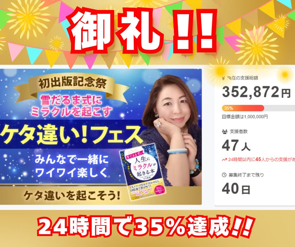 2024/12/30 18:38初出版応援チームの皆さまの、応援のお陰で、当初、24時間で20%達成してオススメに載る!という目標から、途中で25~30%の達成!と、目標数字を引き上げたにもかかわらず!!なんと!それを上回る!!24時間で35%の達成!!!というなんとも予想を遥かに超えた結果となりました!!ありがとうございます!SNS集客・おしゃべり起業の恩師である三浦さやかさんが、出版パーティー用のスタンドフラワーを支援して下さり………出版記念パーティー用リターン品応援チームのメッセンジャーグループで「今、支援しました」「私が1番ノリでした」とメッセージを送って下さった、それがスタートの合図であったかのごとく、皆さんが次々と支援して下さって。お陰様でのこの快挙!!その後の推移を集計してみると、なんと!!その6時間後、スタートからたった32時間後に46%の達成!!ができました!!!その後、さやかさんが周りに呼びかけたりメッセージしてくれたりしてスルスルと出版パーティー前までになんと52%も達成できていたという!!!しかも、人気のプロジェクト16位!!にもなっていました!!こういうのがあると知らずに、ピーク越えて見つけたので、もしかしたらもっと上にいたのかも?(^-^)v本当に!!本当に!!感謝しかありません!!!私は出版パーティーの準備に追われていて、気付けばこんな快挙に!!状態でした!!!心から……ありがとうございます!!!私の数日前にスタートしていたどこぞの有名大物コンサルタントさんよりスゴイ!と、お褒めの言葉も頂きました♪そんな……そんなミラクルなオマケまで付くのか!と、嬉しくて、舞い上がってしまいました♡すっかり中だるんでおりますが(笑)これからラストスパートしていきます!皆さま応援、よろしくお願いいたします!!!♡ もっと見る