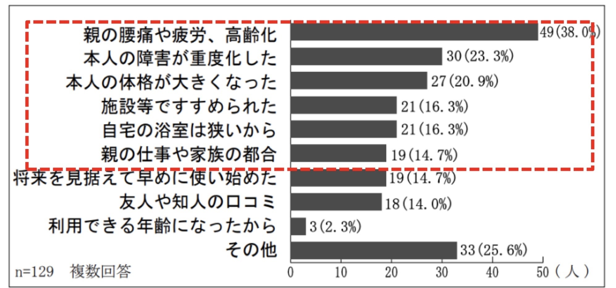 「入浴」は本人やご家族にとって、身体的にも精神的にも負担が大きく、家族全体の生活に大きな影響を与えていることがわかります。
