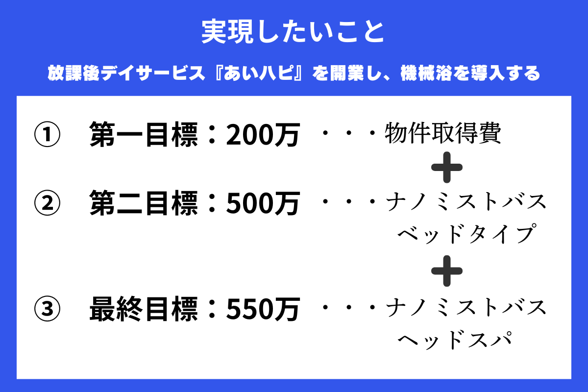 そこでクラウドファンディングを通じて、皆さまにご支援していただいた資金を物件取得費、機械浴設備の購入に充てたいと考えています。