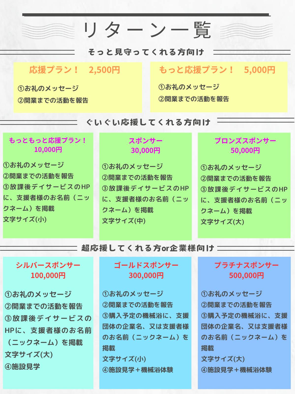 *100,000円、300,000円、500,000円のご支援を頂いた方への施設見学の詳細日時はメールにてお伝えさせていただきます。
