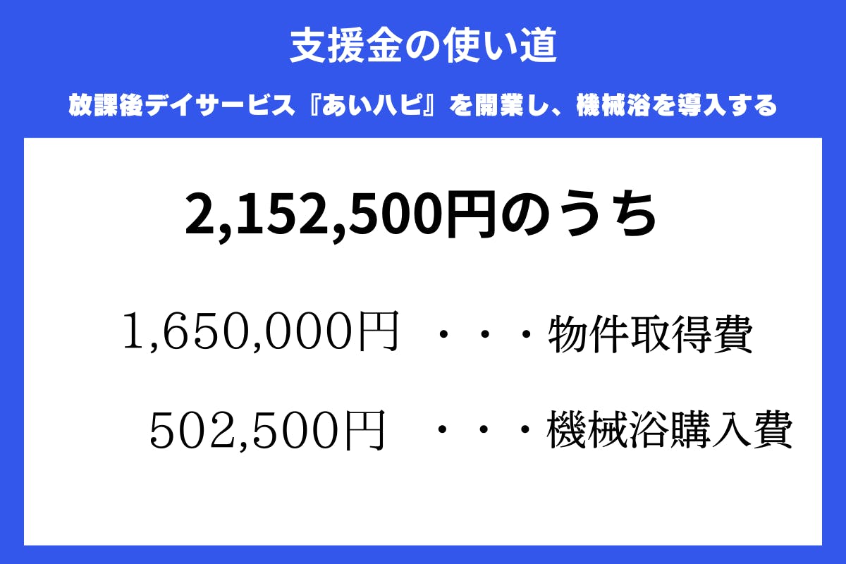 皆さまからいただいた支援金 2,152,500円 のうち、約 1,650,000円 を物件取得費に充て、残りの 502,500円 を機械浴の購入資金として活用させていただくことに決定しました。