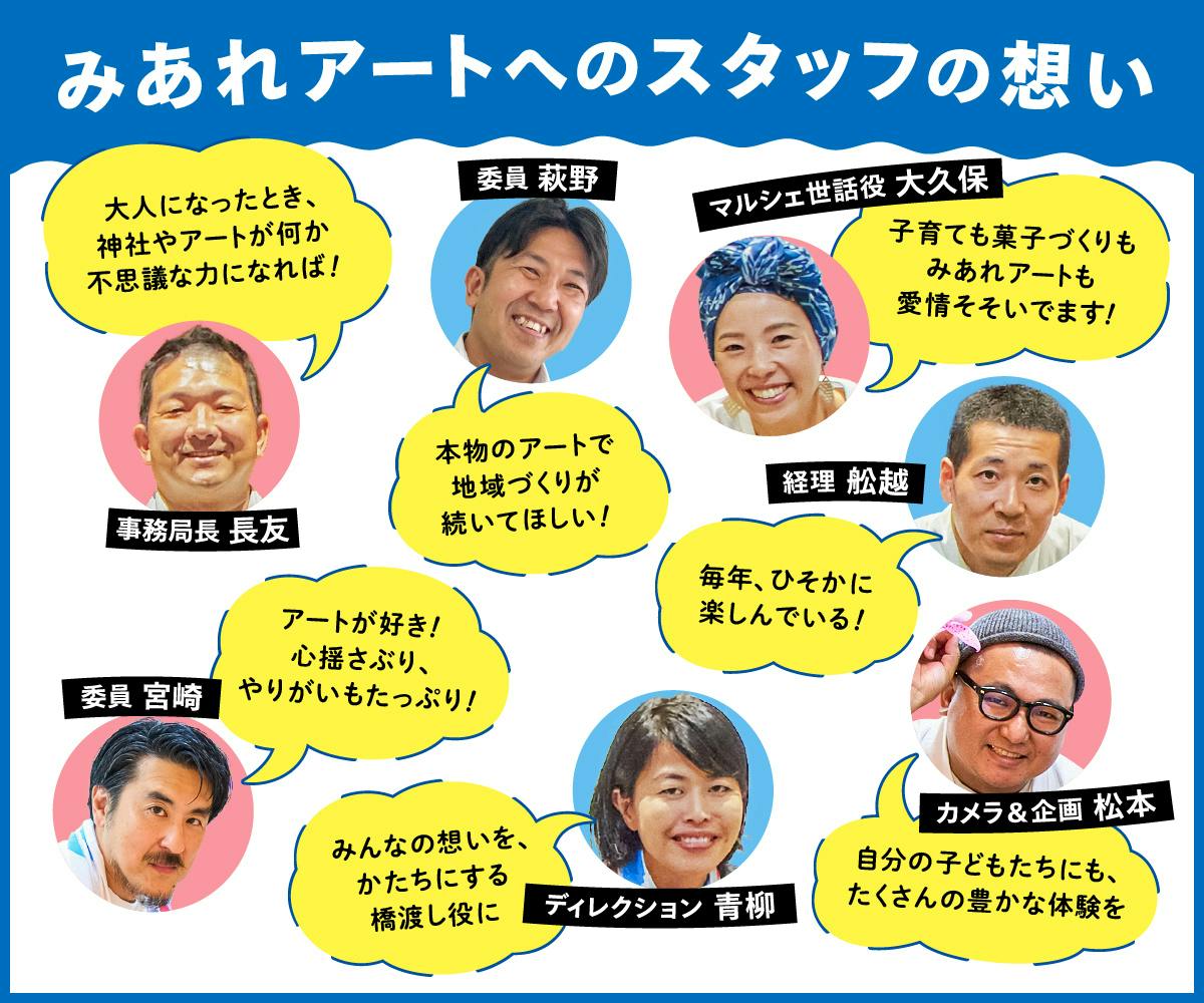 さらに、宗像育ち、宗像で働く人たちが集まった"みあれアート"チーム。この街の意義を広い視野から捉え、いまの社会とともに、どのようなあるべき姿を描けるか、そんな想いで集まったメンバーを紹介します。