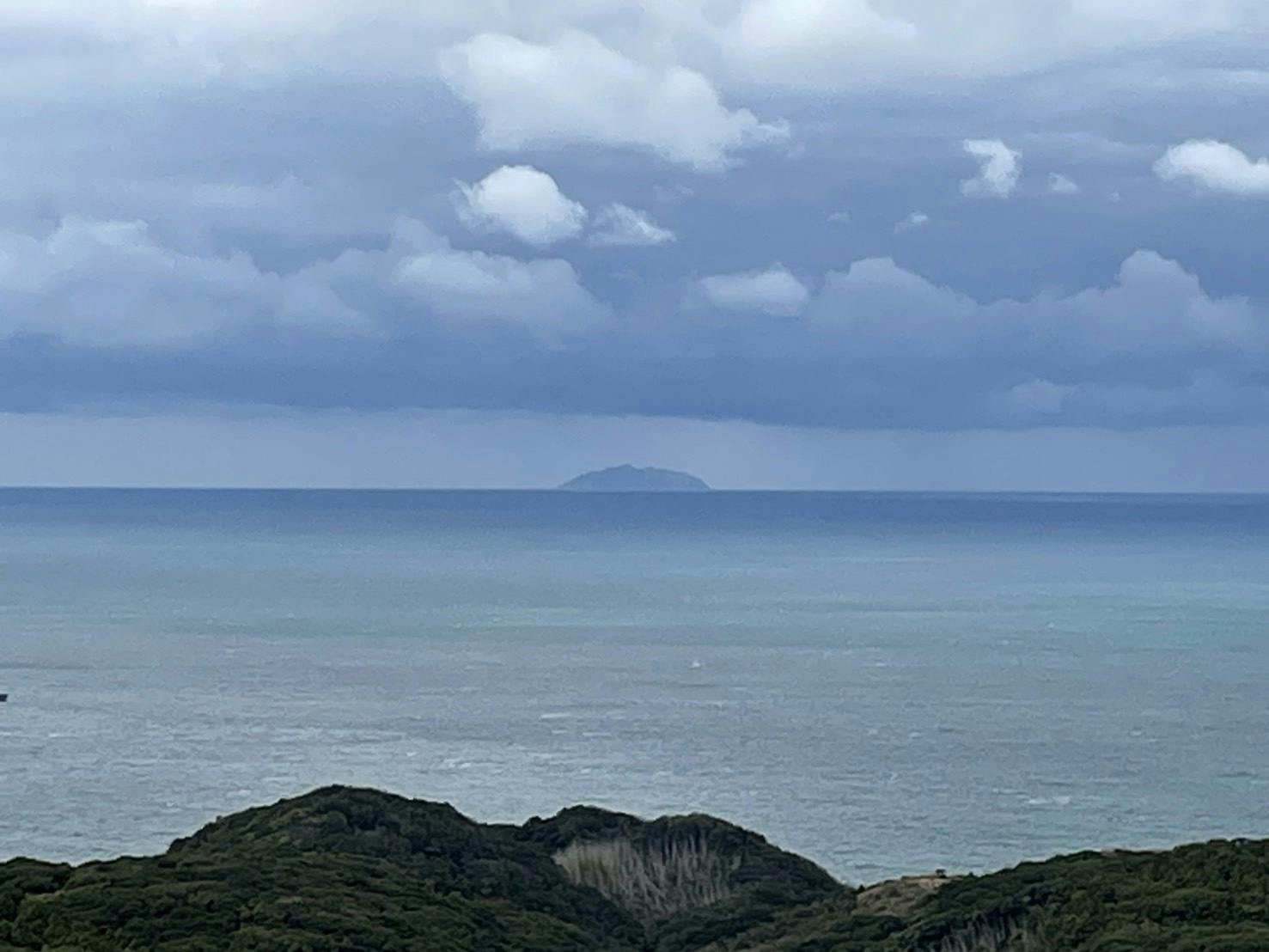 幸運にも一瞬だけ現れた沖ノ島を大島から拝することができました。