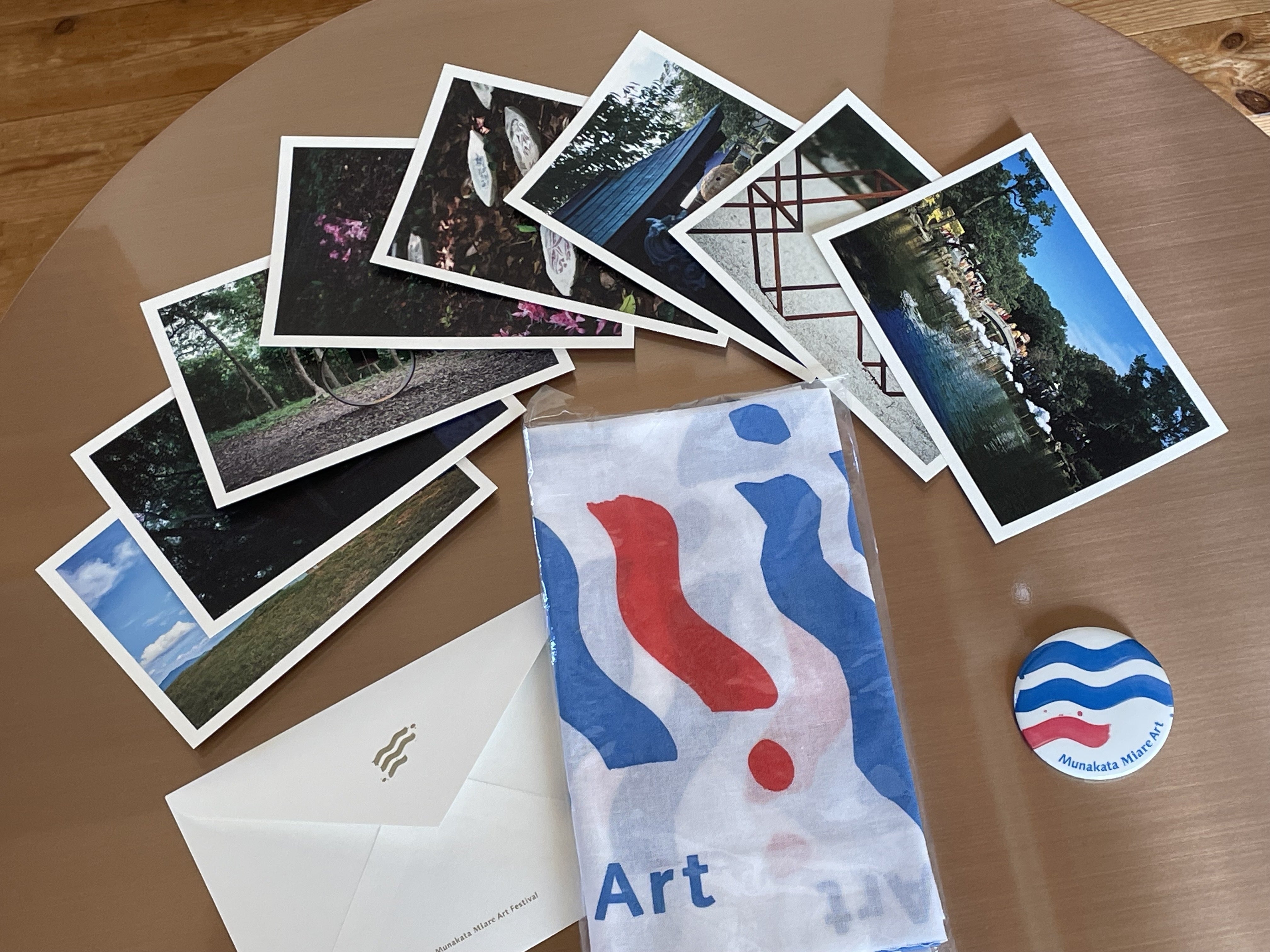 「手ぬぐい+缶バッチ+ポストカードセット」については、当初5枚セットの予定だったポストカードを、2024年の作家の作品をご紹介したく、8枚セットにいたしました。また、宗像大社や宗像ユリックスの風景も収めていますので、ぜひ宗像の空や風を感じながらご覧ください。