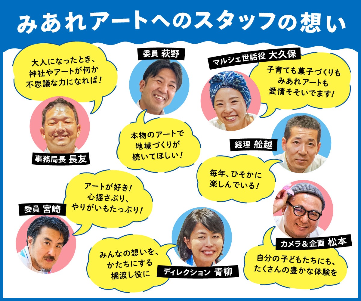 さらに、宗像育ち、宗像で働く人たちが集まった"みあれアート"チーム。この街の意義を広い視野から捉え、いまの社会とともに、どのようなあるべき姿を描けるか、そんな想いで集まったメンバーを紹介します。