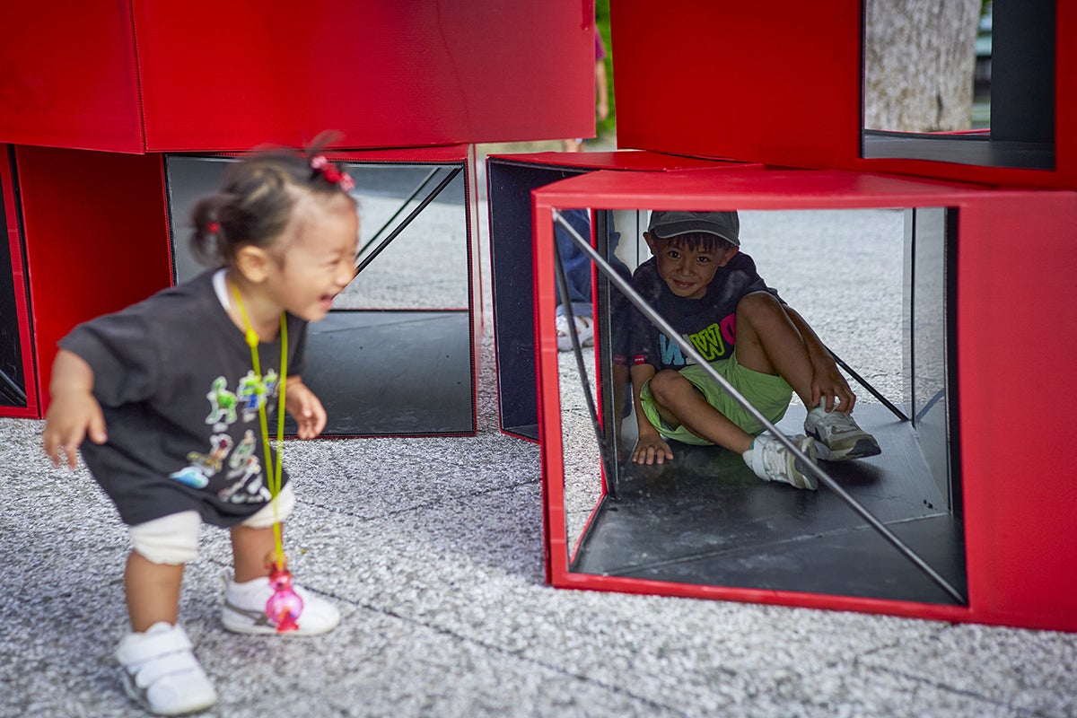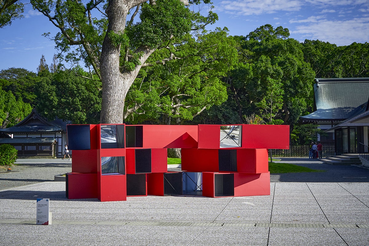 赤い筒を覗くと、境内のいろんな風景が楽しめる建築家・戸室太一の作品(2023年)加えて「芸術祭が開催される10月に、ユニークな現代アートを境内に設置してほしい。また、国宝8万点からインスピレーションを得て表現してもらえるとうれしい」。