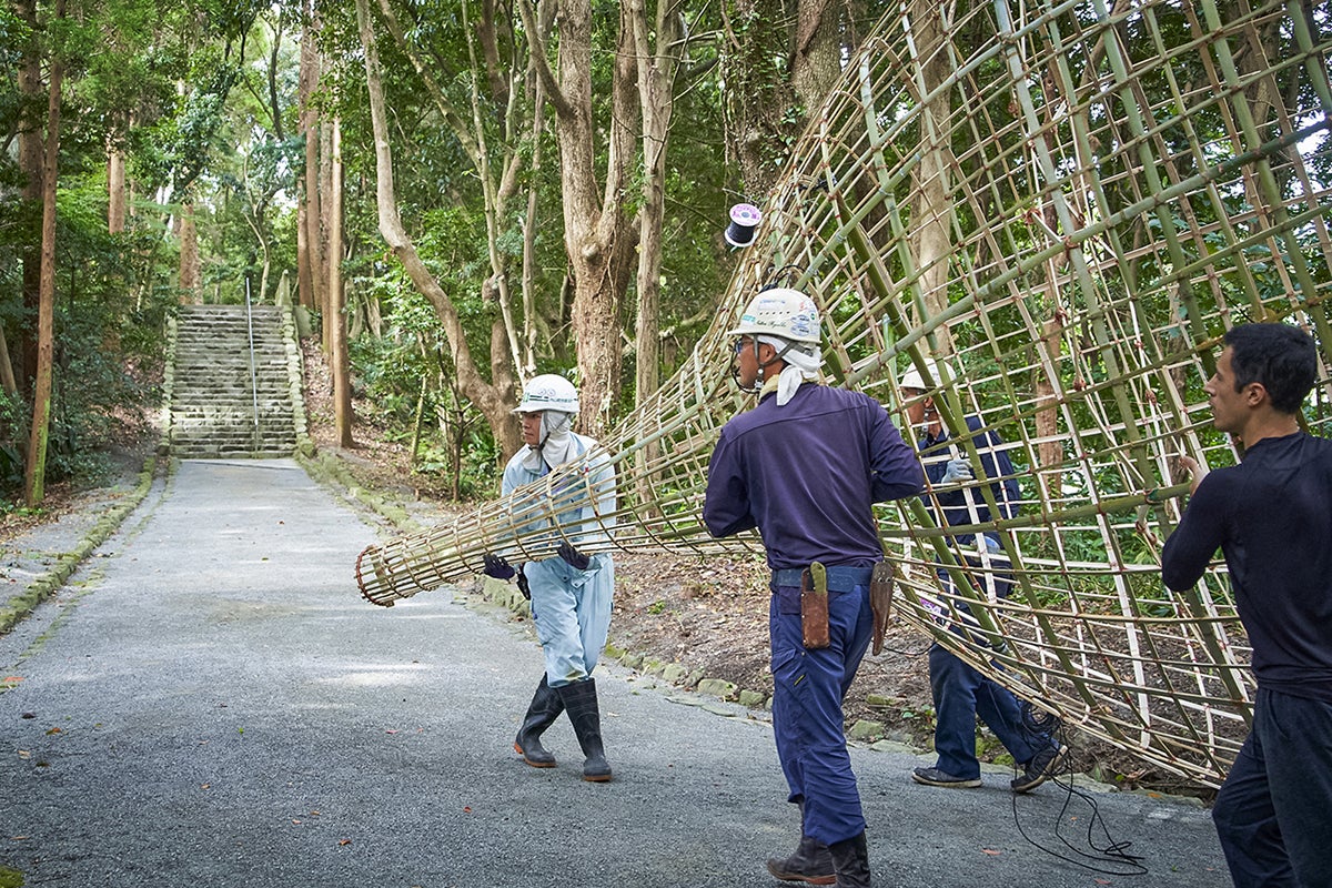 竹でつくった高さ7mの大型の魚籠(びく)をみんなで運んで会場へ(2023年)また、作品の質を保つためには、安全面もしっかりと考えています。そのうえ、世界遺産であるため貴重な史跡や文化的背景を守り維持するために、アート作品も展示空間を壊さないように配慮しています。