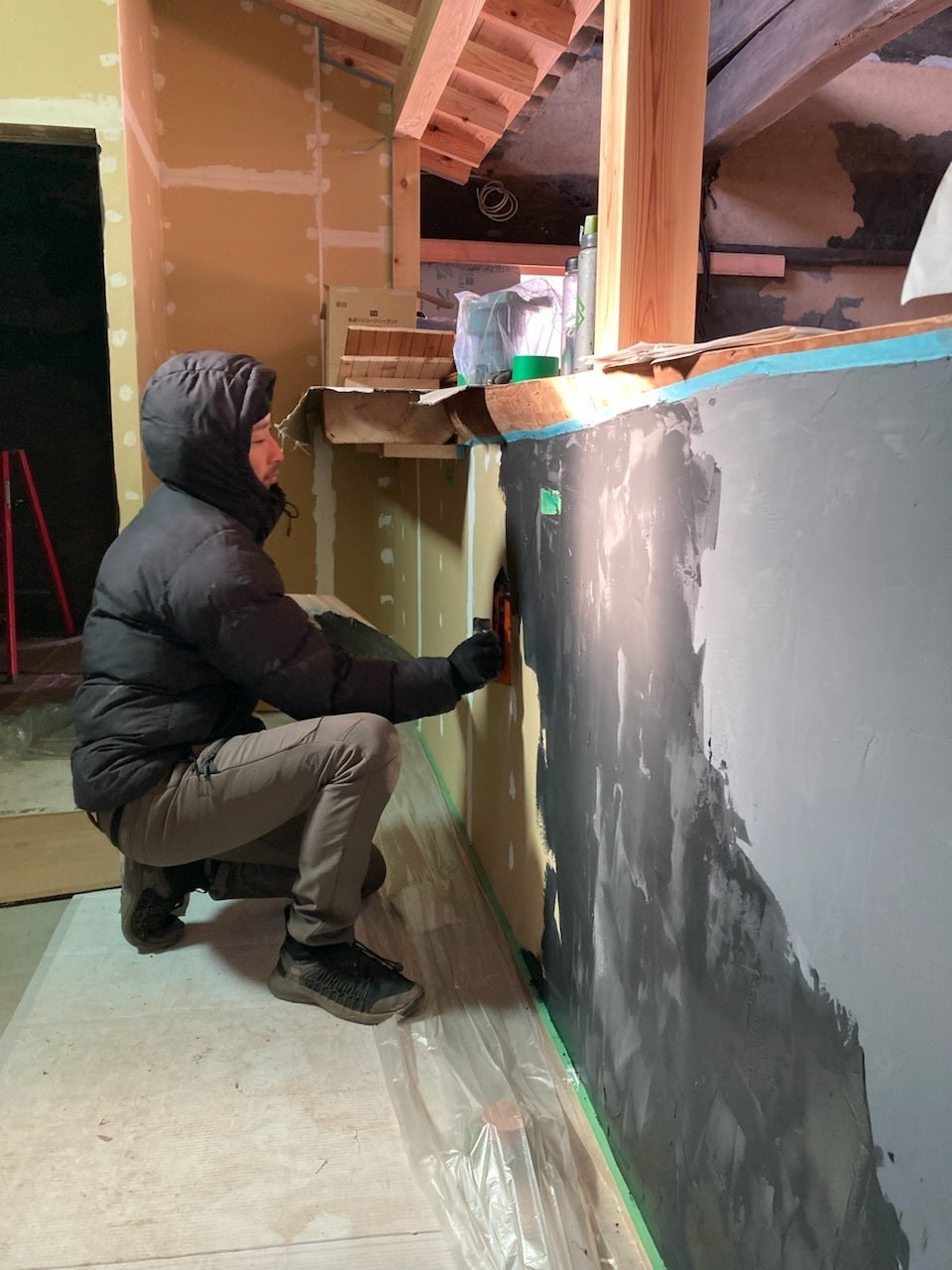 そしてDIY作業は内部に移っています。本日からいよいよ内壁の漆喰塗りを始めました。カフェ部分は濃いグレーに、客室部分はベージュの漆喰を考えています。