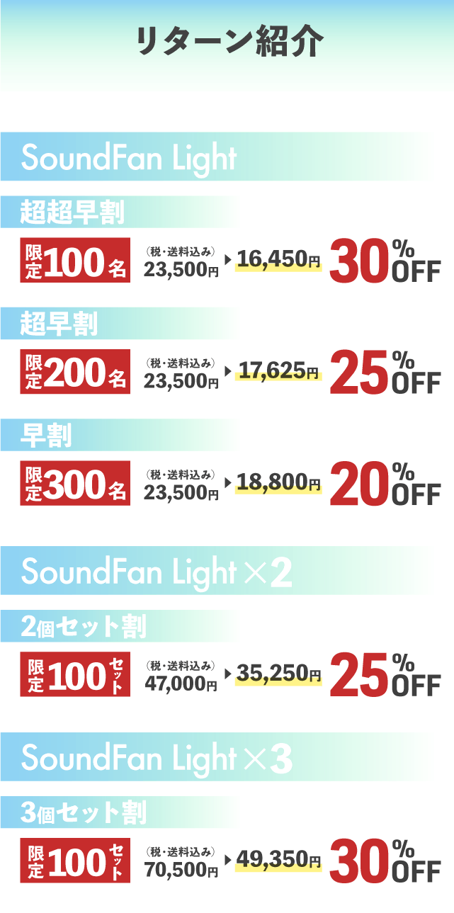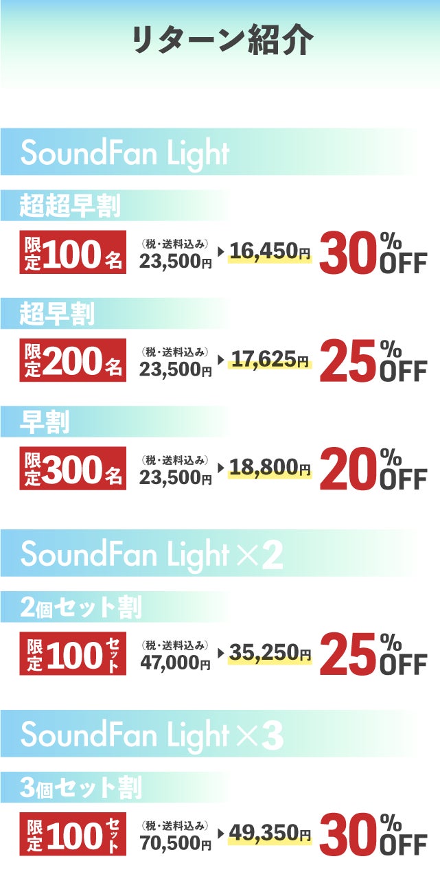 また、SoundFan Lightは長期2年間の保証をおつけしています。