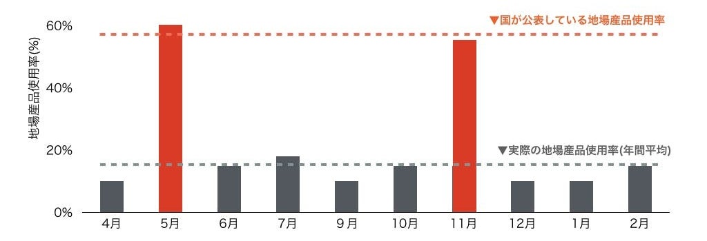各自治体は、国への報告義務のあるこの期間に合わせて、地産品の積極活用を行っているのです。つまり、この56%という数字は、毎年この時期に生じる「ピークの平均」を捉えた特異な数値であり、実態を表していないということです。