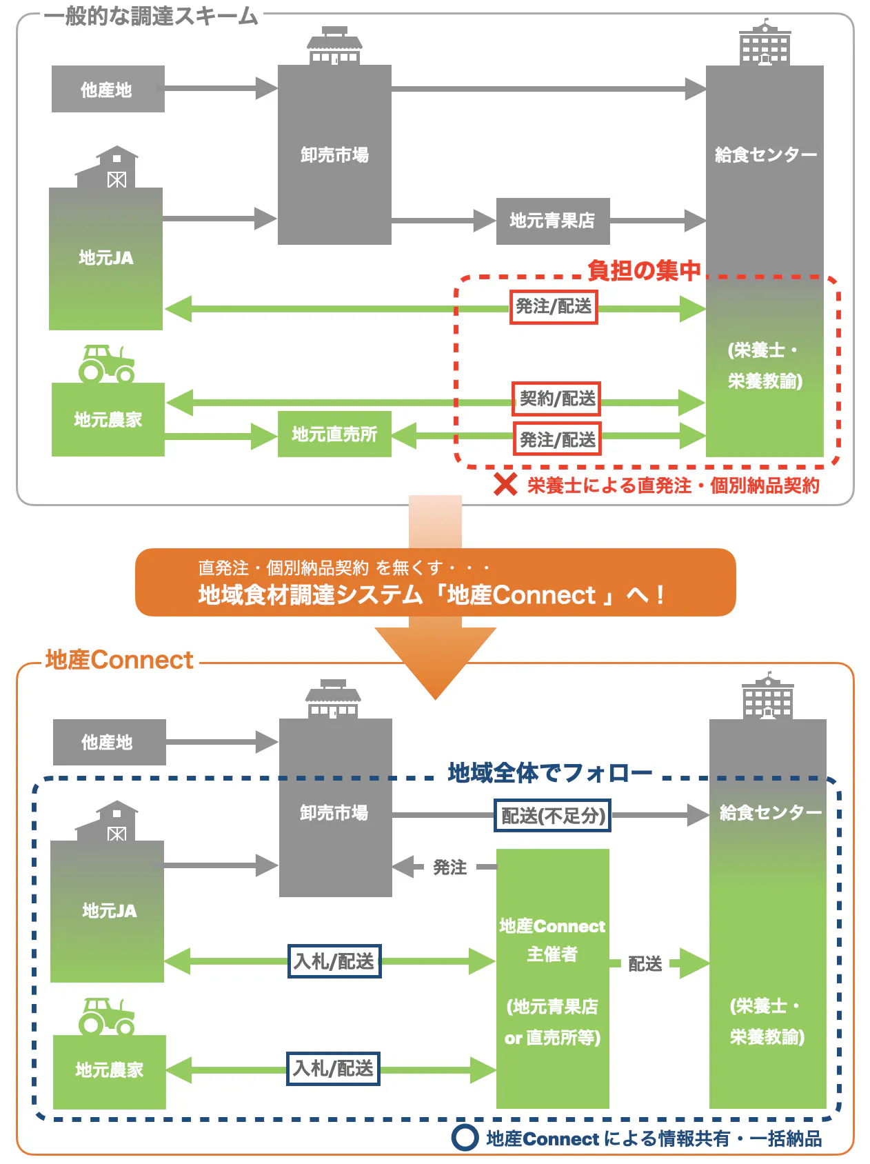 そこで私たちは、既存の食材調達スキームを革新する「地域Connect」という新しい仕組みを考えました。発注、調整の負担が偏っている現況から地域全体でフォローできる体制へ移行させるための仕組みであり、それを統合するシステムです。