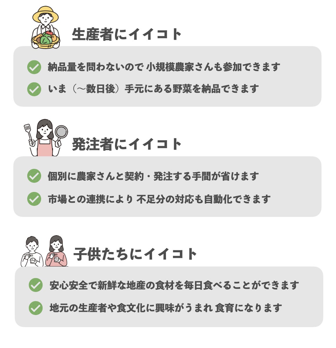どこかに負担が偏る現況から地域全体でフォローできる体制へ移行するために、情報共有を進め、納入条件を整えて、持続的な地産品調達を可能にしよう!・・というものです。