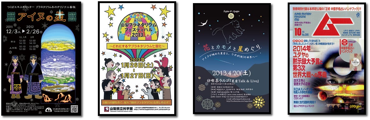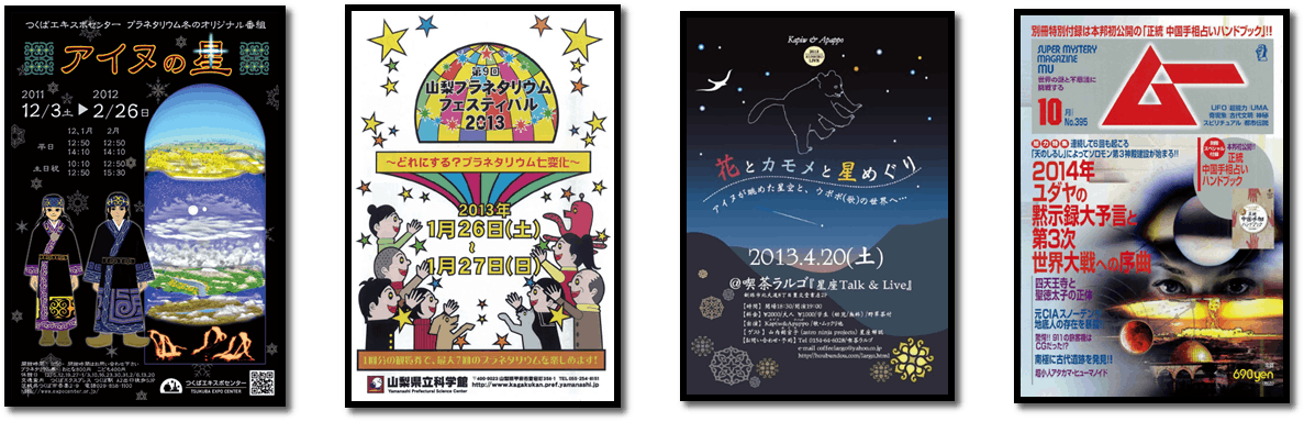 活動を始めた2012年以降、プラネタリウムの番組制作や、ゲスト解説や講演をさせて頂いたり、アイヌ文化の伝承者の方たちとカフェイベントを行なったり、はたまた月刊「ムー」(2014年10月号)に巻末20Pの記事を執筆させて頂いたりと、色々なアプローチで取り組んできました。