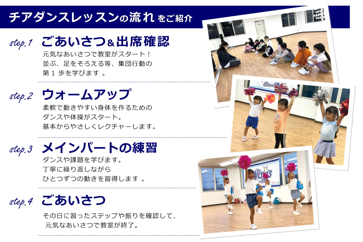 私たち「Wings」チアダンス教室は、ダンステクニックの向上だけでなく、「元気な挨拶・返事ができる」「常に笑顔」「人を応援する心」「チャレンジ精神」「ワンチームとなる」をテーマに、日々練習に励んでいます。