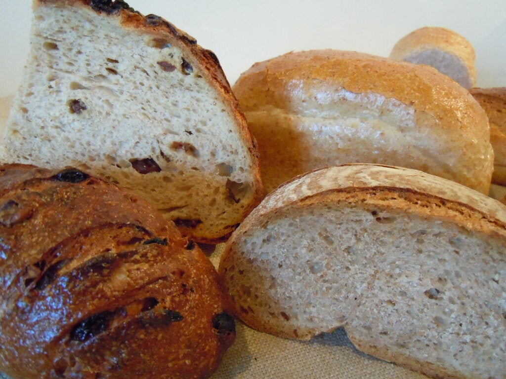 パンは、しっかり焼きこんだハードタイプの日持ちするパンです。生地は、粉と酵母(オーガニックレーズンと国産全粒粉)と塩と水だけ。そこにレーズンやクルミ、ライ麦などを入れたもの、形やサイズ違いなどがいろいろです。添加物はもちろん、砂糖類、油脂類は全く入れていません。