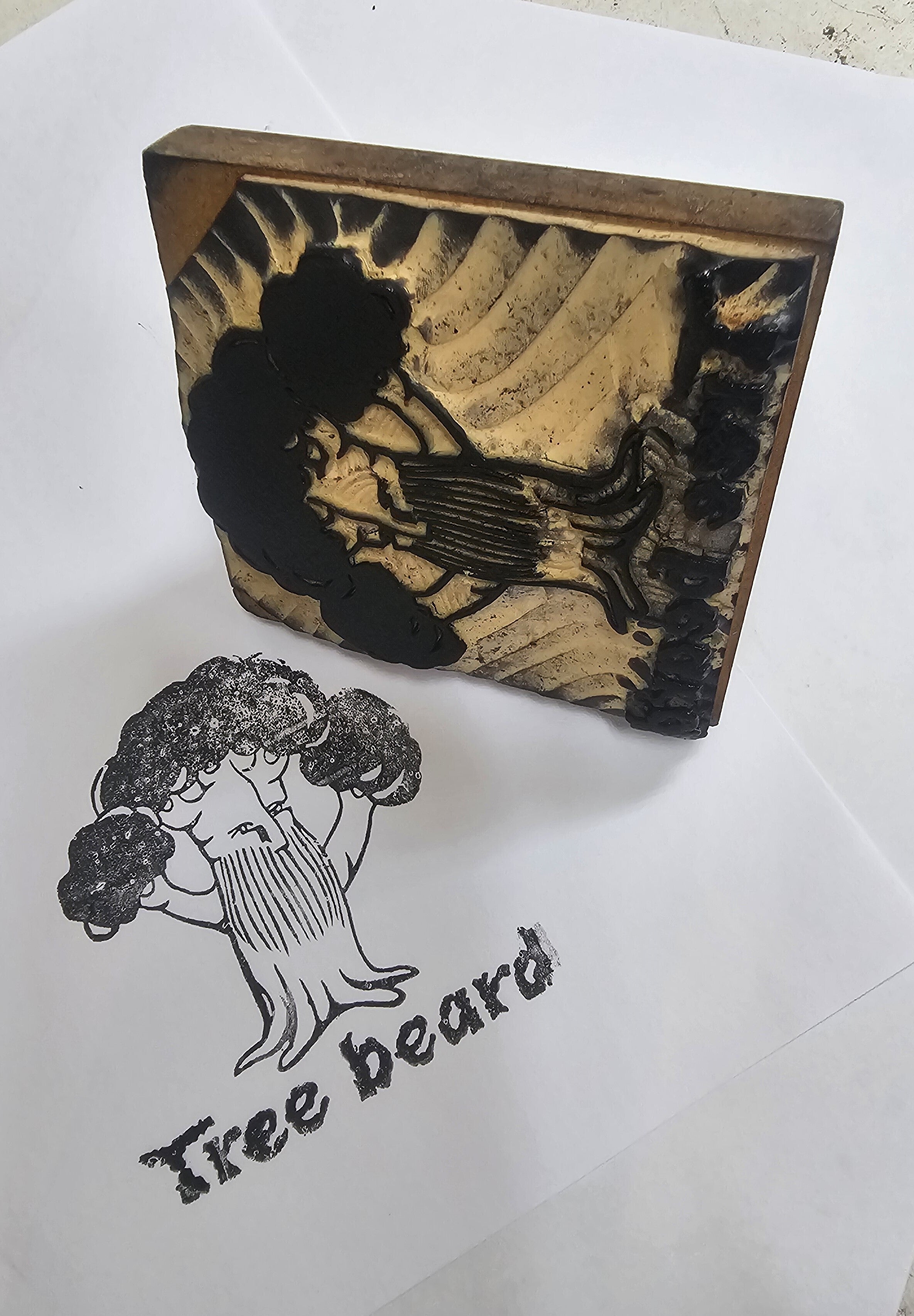 開店のお祝いに、友人が「Tree beard」の手彫りゴム印をプレゼントしてくれて、それをプリントしてTシャツを作ったのが30年くらい前のこと。