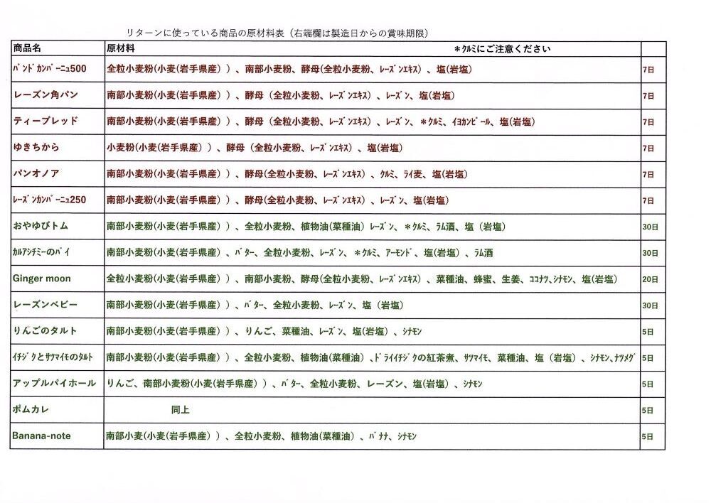上記リターン品の原材料一覧(以下の内容とカロリー表示は各商品に一括シールを貼っています)