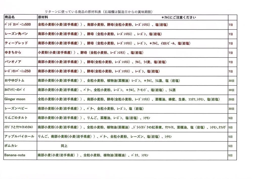 創業時から現在まで、原材料は低農薬の岩手県産南部小麦、ドライフルーツやナッツはオーガニック限定、卵や牛乳は遺伝子組み換えでないもの、その他全て自分たちが安全でおいしいと確信を持つものを使っています。