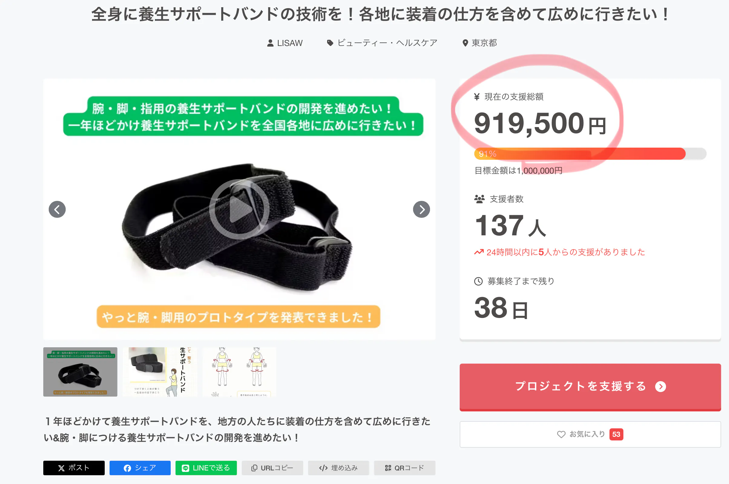 現在、腕・脚用の養生サポートバンド&全国でのワークショップ開催のためのクラウドファンディングを行なっていますが、あとわずかで目標金額達成いたします!