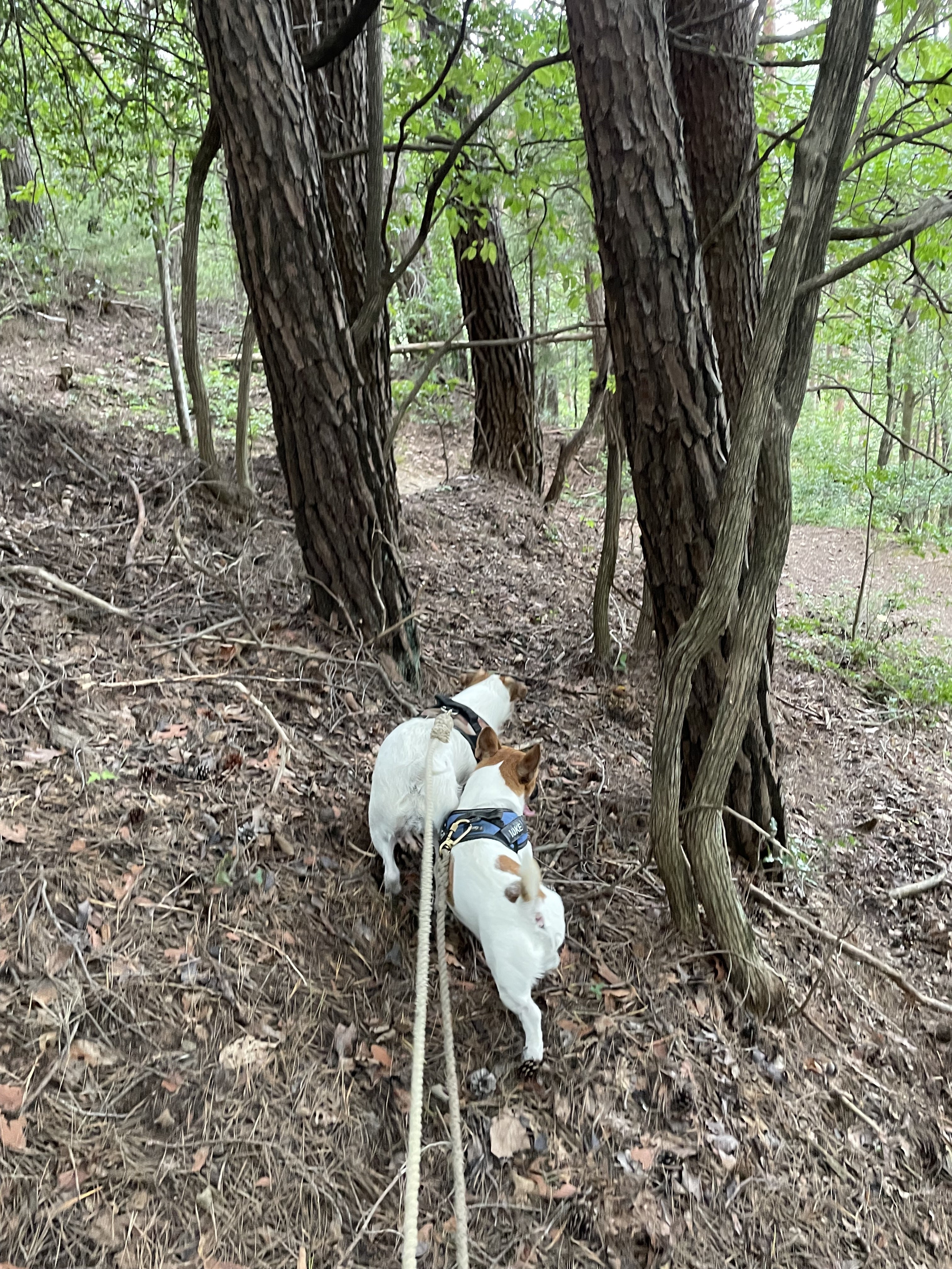 私自身は、2匹のジャックラッセルと理科探しの日々を過ごしています。上の写真は、松林で松茸を探すCandy(奥)とRuku(手前)です。松茸犬はあくまでも私見です。