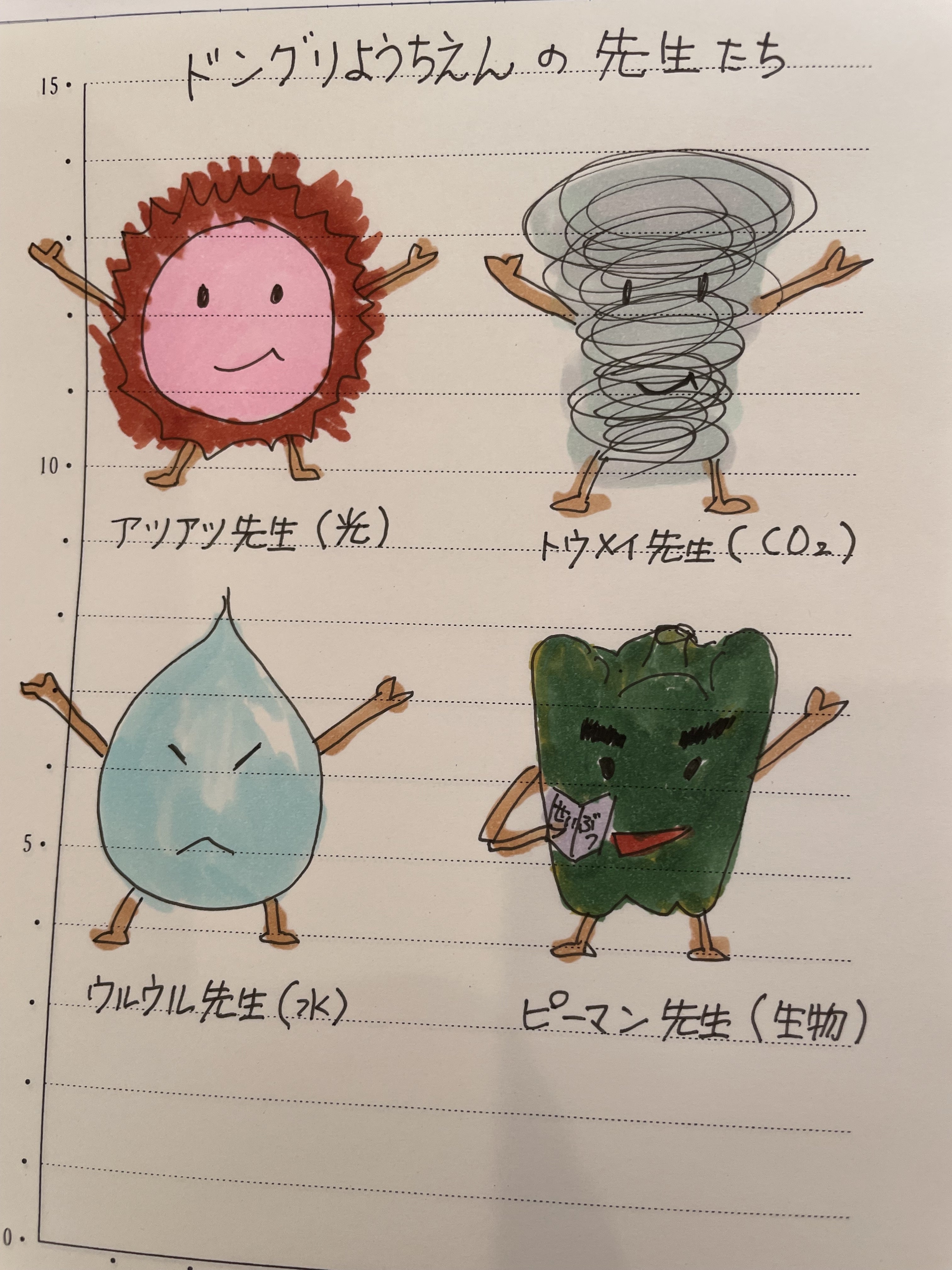 ドングリ幼稚園には、光、水、二酸化炭素の植物に必要な先生方がいる中で、ピーマン先生が生きることの意味について、ドングリたちに問いかけます。しかし、ある時、子ども達を助けようとしてクマくんに食べられてしまいます。どうなるピーマン先生?