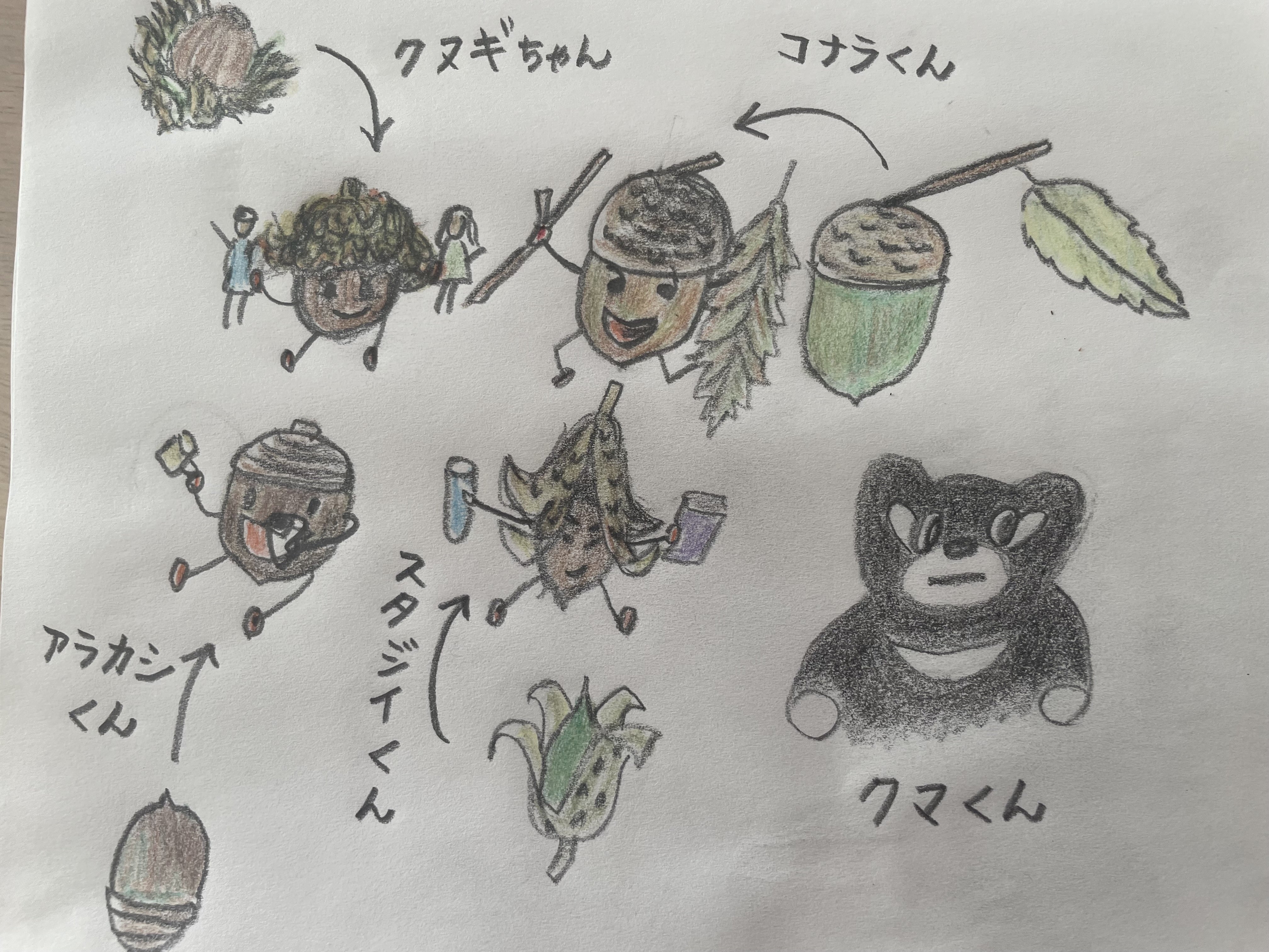 オレンジ色の服を着たカシの女の子と(左上)と緑色の服を着て自分の葉っぱを盾にしているナラの男の子(右下)が主人公の予定です。広葉樹のドングリだけでなく、針葉樹のボックリ(右上)も登場します。
