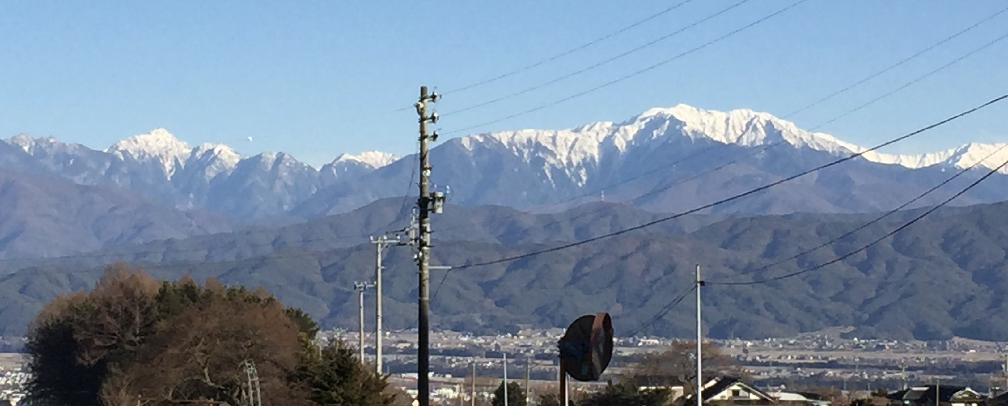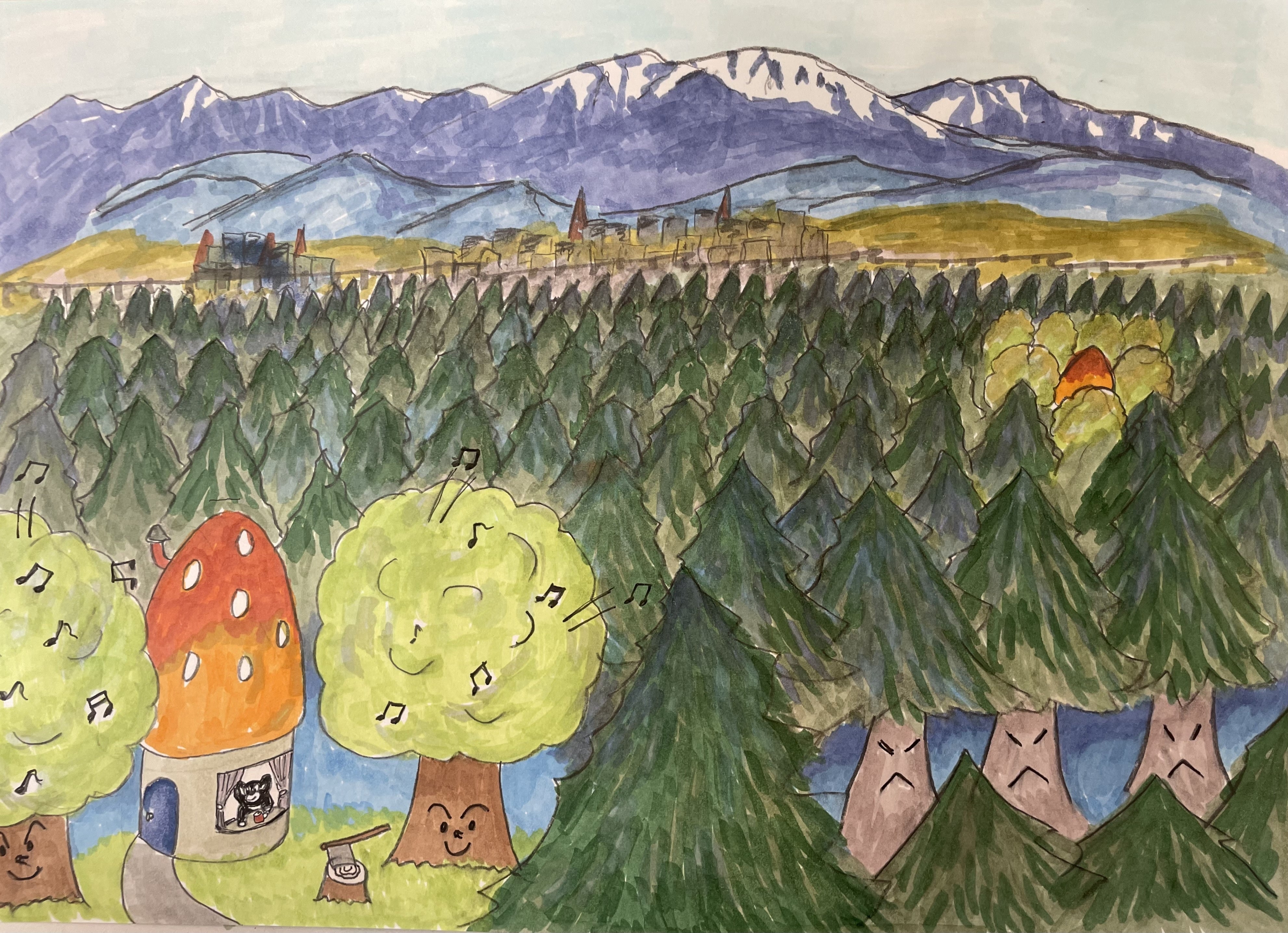 下の絵は、三話の絵本に共通する表紙の絵です。山々は、私の住んでいるところから見える南アルプスです。そして、その麓の森が今回の絵本の舞台です。未来のお話なので、山以外の風景は、今と違っているはずです。