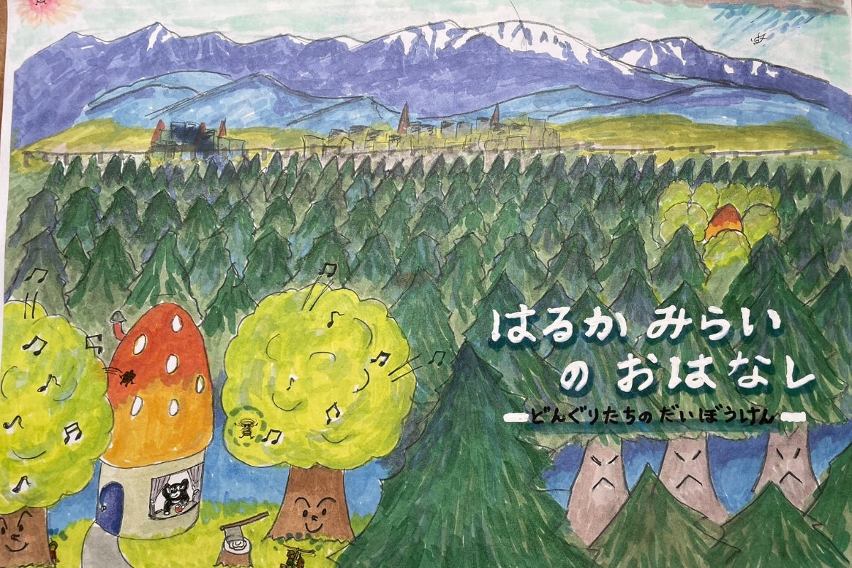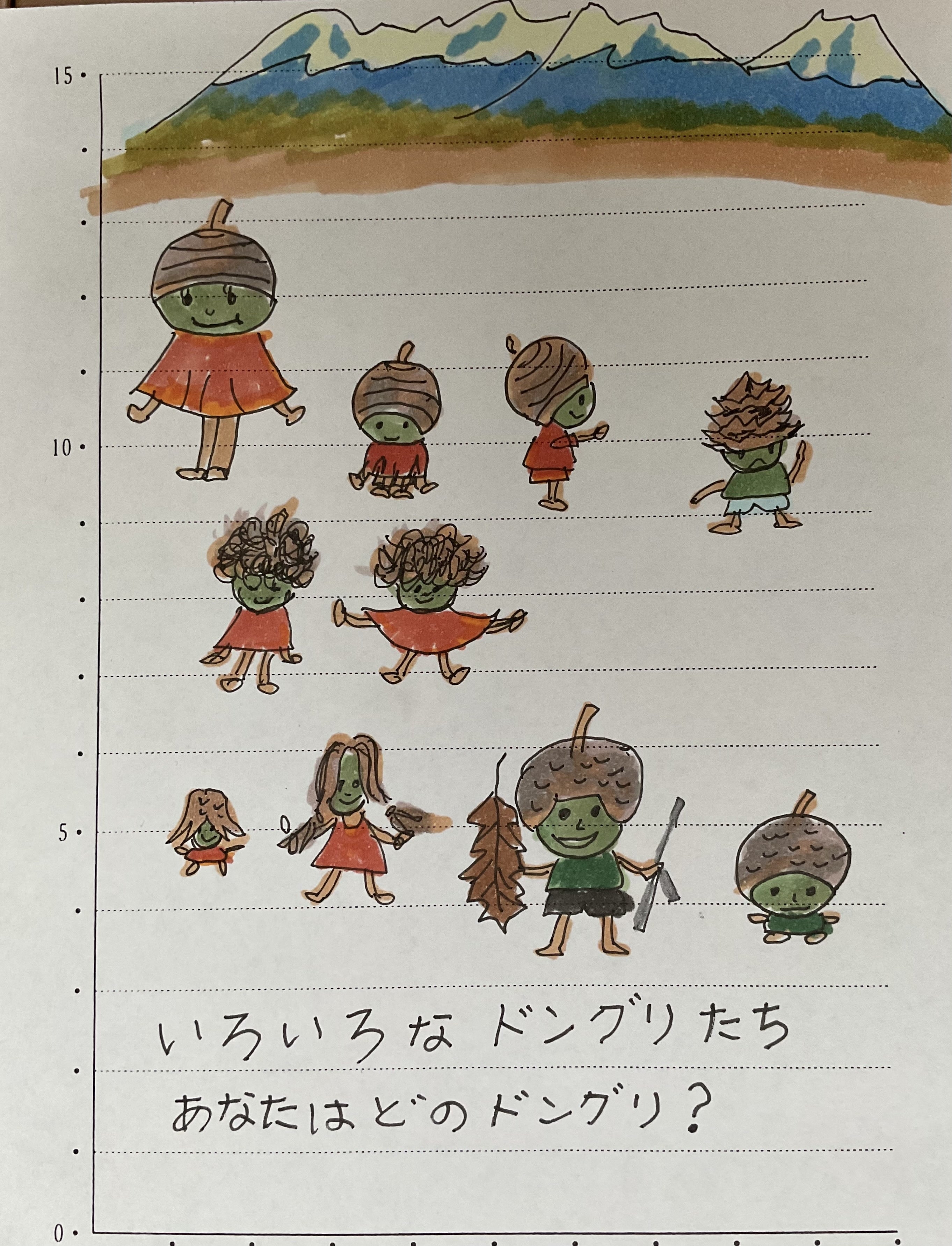 絵本は、未来の森(南アルプス)が舞台です。人間がいなくなったであろう世界で、動くことができるどんぐりと、どんぐり幼稚園のピーマン先生、そして、人間のように二本足で歩くクマを主人公にします。植物は動けないのに、どうやって離れたところに子孫を増やしていくのか、植物の戦略を含めた生き物のコンセプトをエッセンスとして入れていきます。(どうして未来で、動物の中でクマだけがいるのか?もあります)