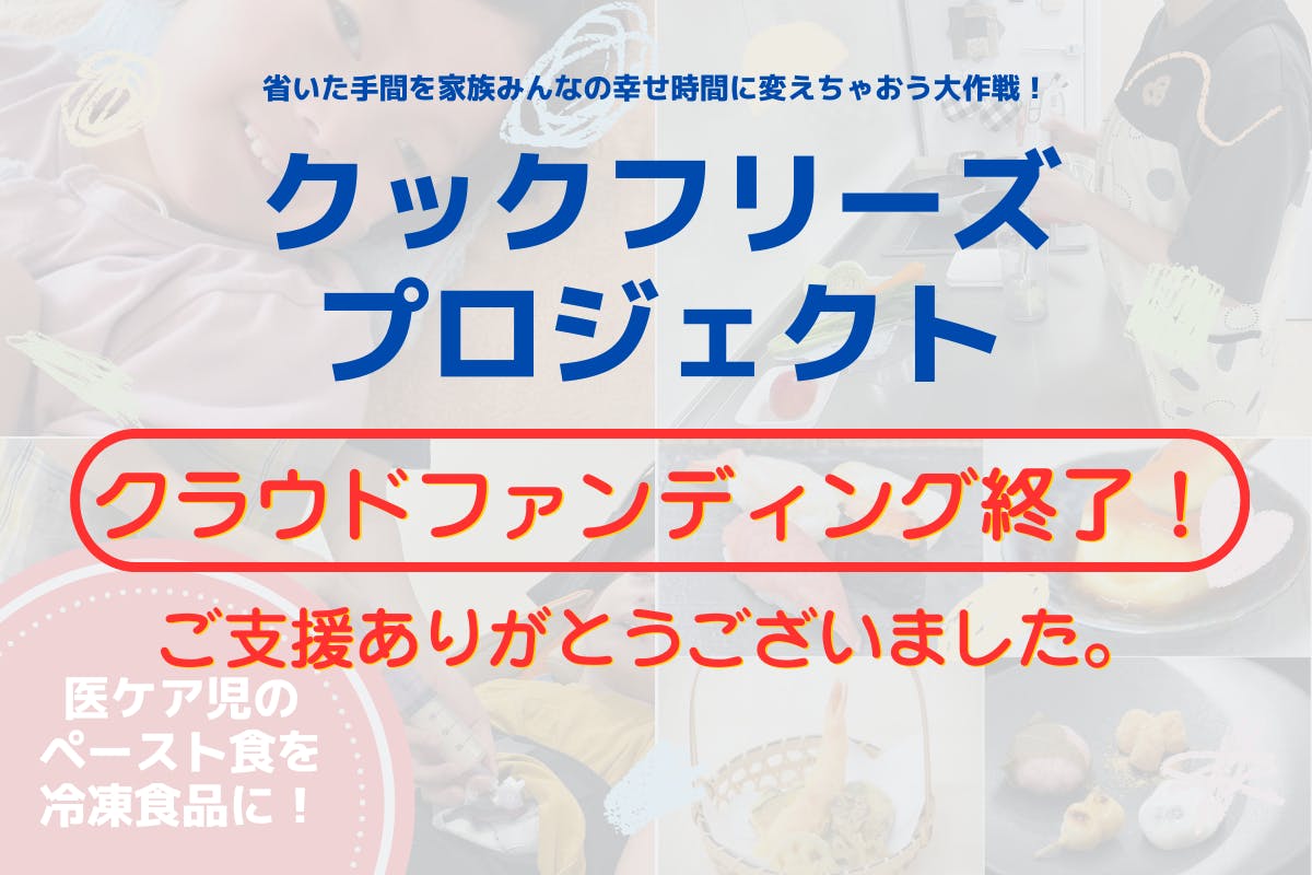 2024/10/23 20:58皆様から多くのご支援をいただきまして、なんと!クラファン挑戦から1週間で目標金額を達成することができました。どれだけの方々に関心をもっていただけるのか、想像すらできない状態でのスタートでしたが、こんなにも関心をもっていただけたことに大きな驚きと喜びを感じています。ご支援はもとより、共感や励ましのメッセージまでいただきまして、本当に!本当に!ありがとうございます。本プロジェクトは、医療的ケア児や重症心身障害児とそのご家族の食事をより豊かにすることを目的としています。そして、食事を通してご家族全員の幸せ時間が少しでも増えることが私たちの思いです。私たちの今回の取り組みは、その入り口に過ぎません。ペースト食に限らず、形状もメニューも、まだまだ広がる可能性を秘めていると確信していますし、その可能性の分だけ幸せ時間も増えていくと考えています。クラファン開始からあまりにも早い展開に実感が追いついていませんが、『省いた手間を家族みんなの幸せ時間に変えちゃおう大作戦!』の可能性を見据えて、ネクストゴールに挑戦させていただきます。ただし、目標金額は設定しません!募集期間内ギリギリまで、本プロジェクトの趣旨を多くの方々に知っていただけるよう、全力で走り抜こうと思います!もちろん、引き続きご支援いただければ大変有難いですし、可能性に向けた運営費に充てさせていただきます。残り約1ヶ月間、今後ともよろしくお願いいたします。 もっと見る