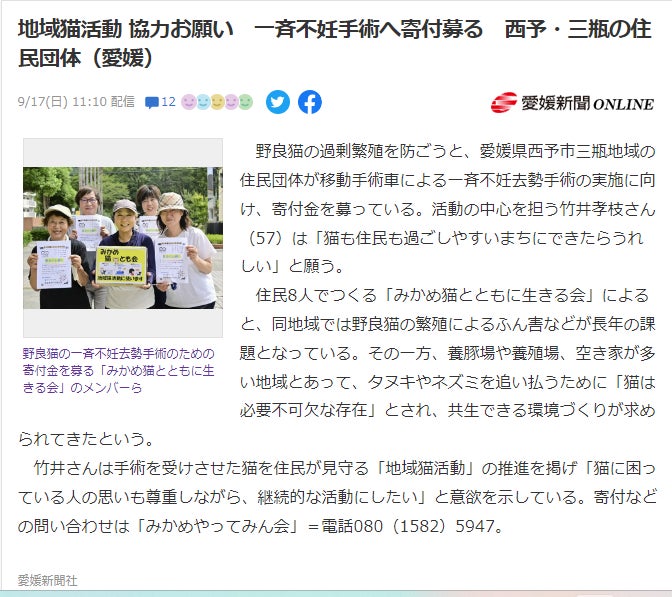 昨年9月、愛媛新聞に初めての地域猫活動となる一斉不妊去勢手術の実施に向けて、寄付金を募る記事を