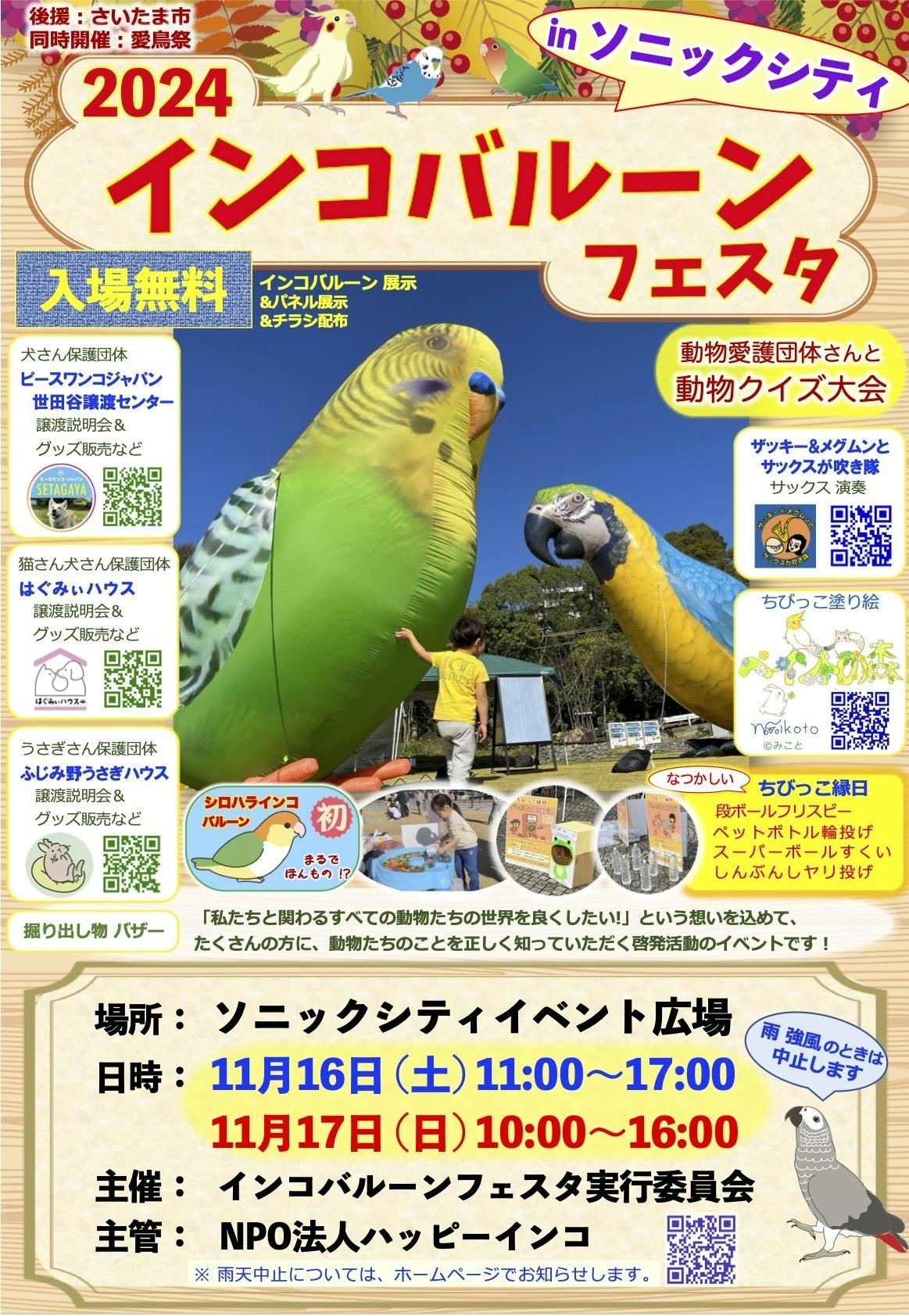 2023年11月予定 イベント開催 さいたま市 インコバルーンフェスタ in ソニックシティ(自主企画・同時開催 愛鳥際)