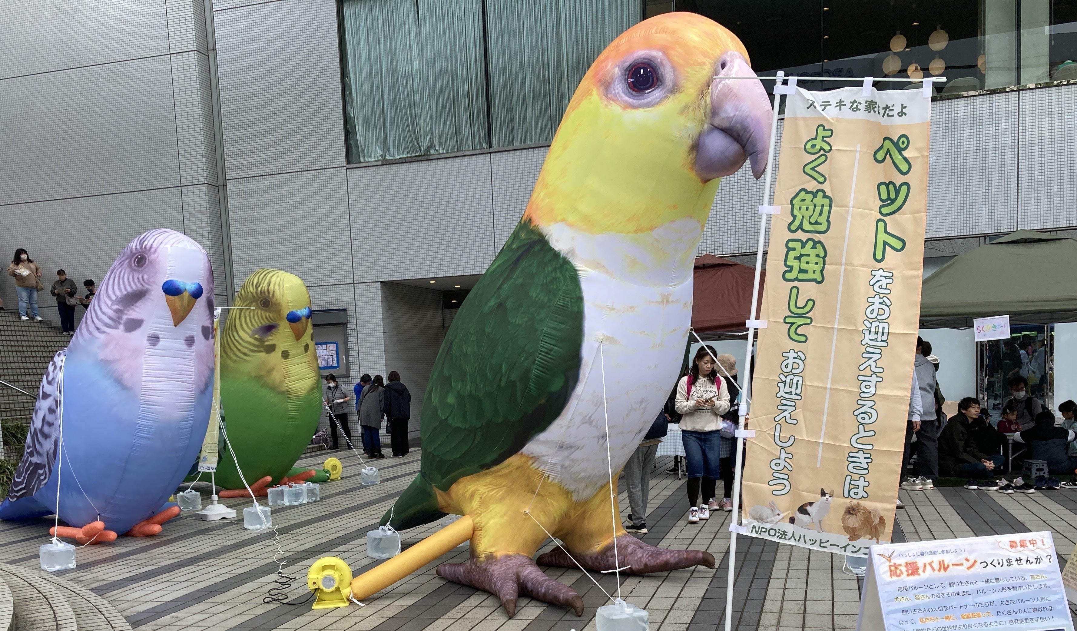 初お披露目のシロハラインコバルーンとともに、動物愛護の啓発活動ができました!