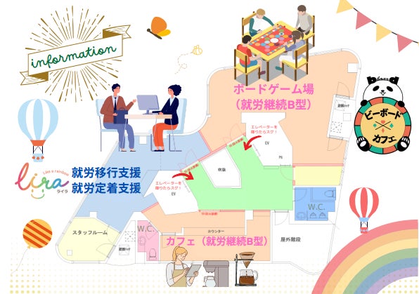 「多機能事業所ライラ」では、ボードゲームカフェ「ビーボードカフェ」を併設して、就労継続支援B型事業所を利用するメンバーさんに、ボードゲームの対戦相手(プレイヤー)として働いていただくことを目的としています。