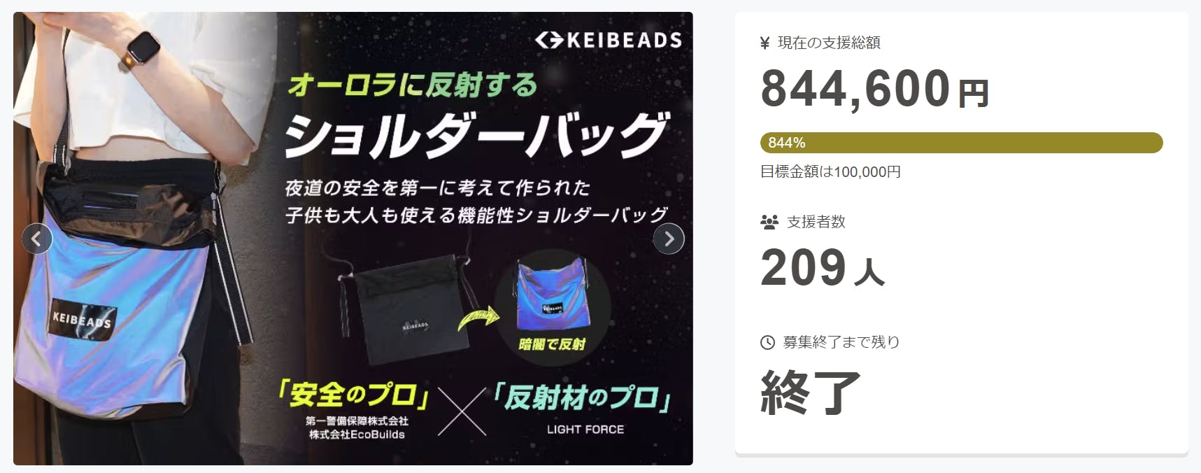2024/10/15 09:28KEIBEADSの荒木です。ショルダーバッグのクラウドファンディングが終了しました。209名の方にご支援いただき、844%達成することができました。ありがとうございます!これからも反射材を使ったアイテムを企画していきますので、追いかけていただけると嬉しいです!!今後ともよろしくお願いいたします。 もっと見る