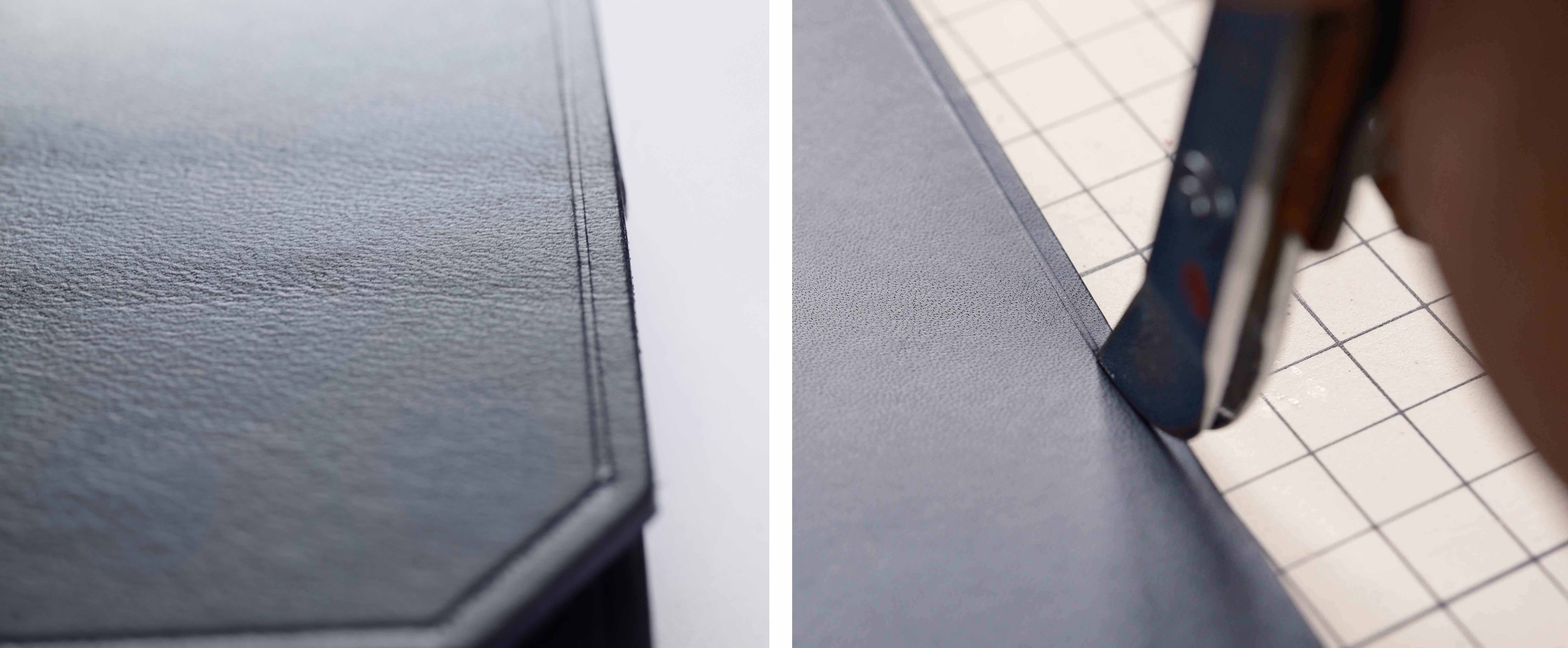 革を裁断した切り口は、一つ一つ染料とロウを染み込ませて仕上げています。