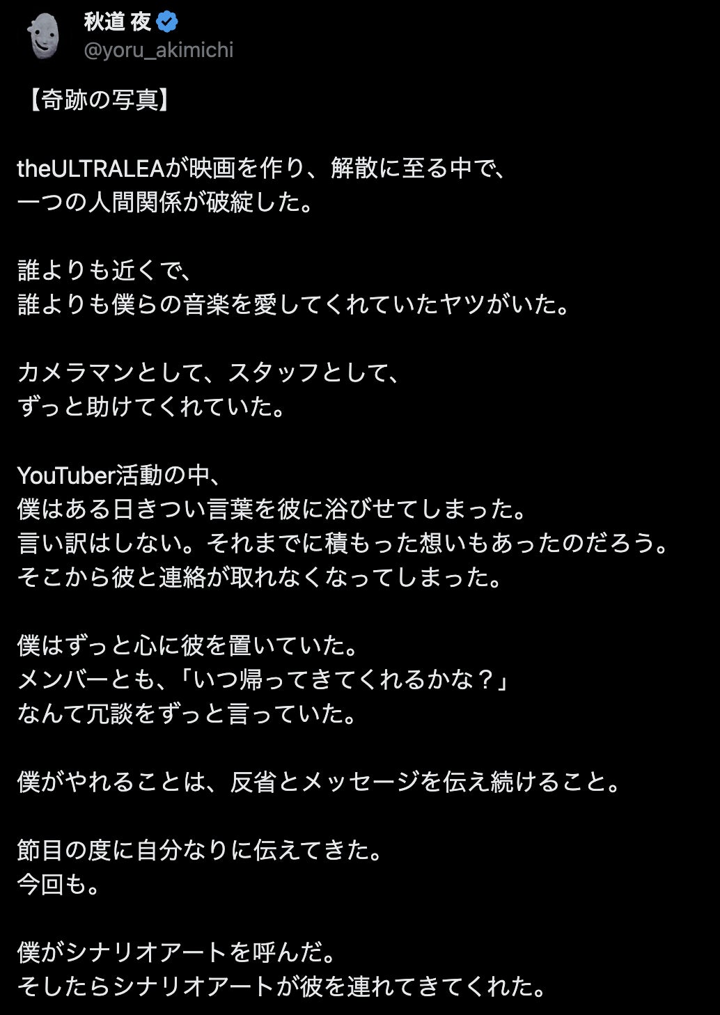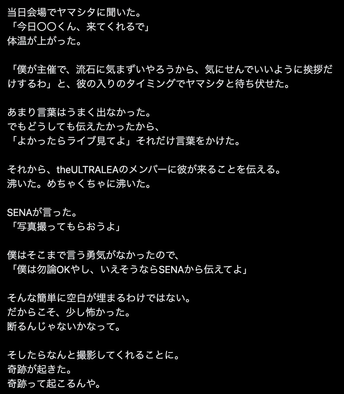 その後、僕だけじゃなく、メンバーとも彼は遅くまで話をした。今までの時間を埋めるように。