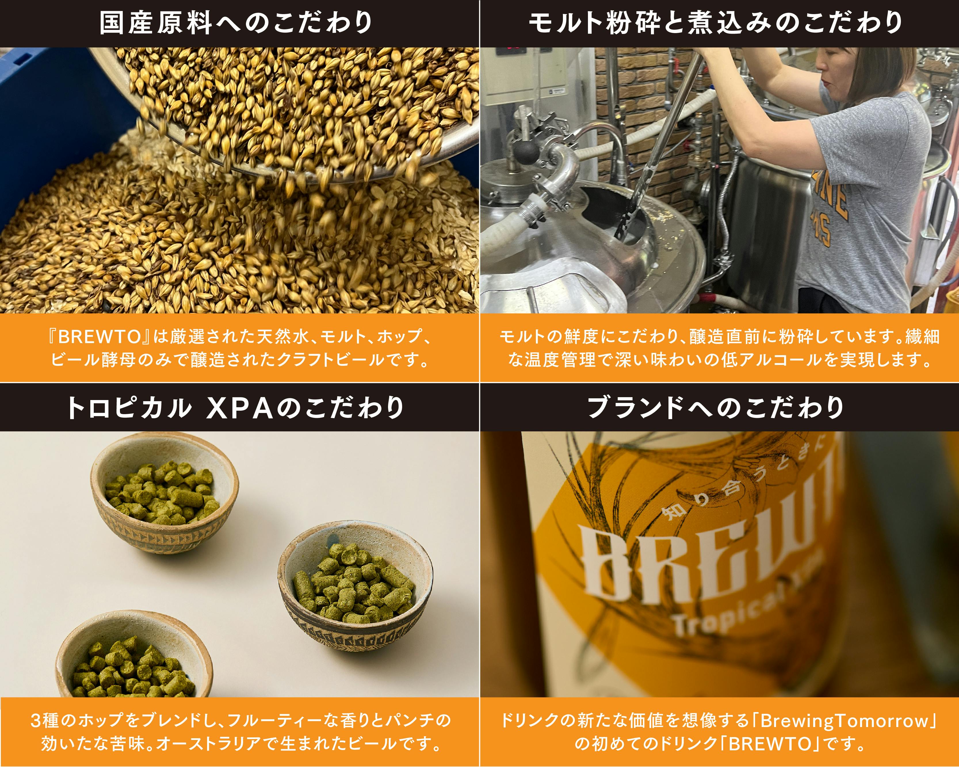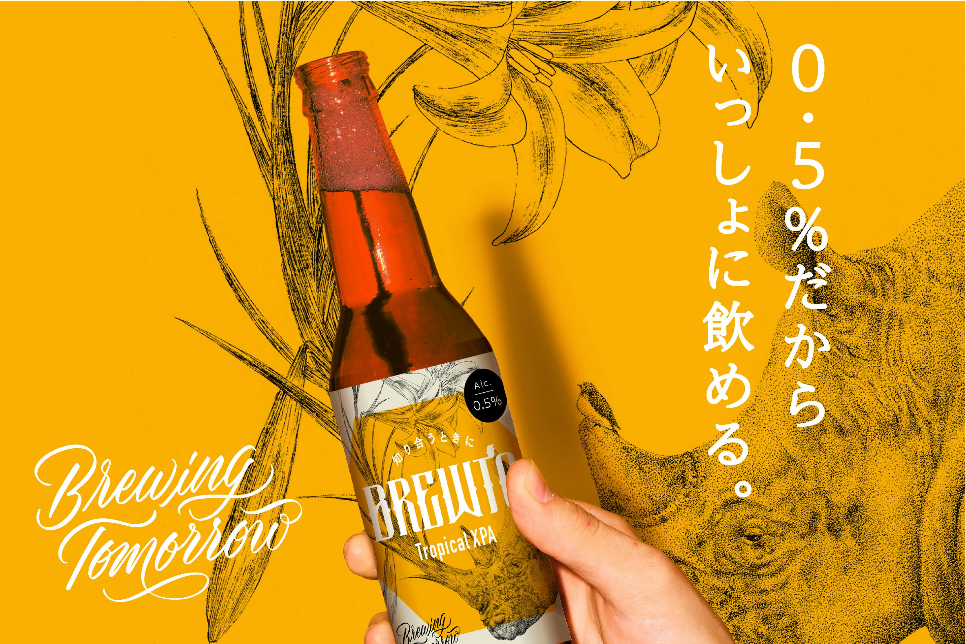 私たちはローアルコールドリンクブランド『Brewing Tomorrow』を立ち上げました。そして第一弾のプロダクトとしてアルコール度数0.5%のクラフトビール「BREWTO(ブリュート)」を開発。クラフトビールとまったく同じ素材・製法にこだわってつくり上げました。飲む人は妥協することなく満足でき、飲まない人もアルコールを気にせずクラフト感を楽しめる、新しい味わいです。