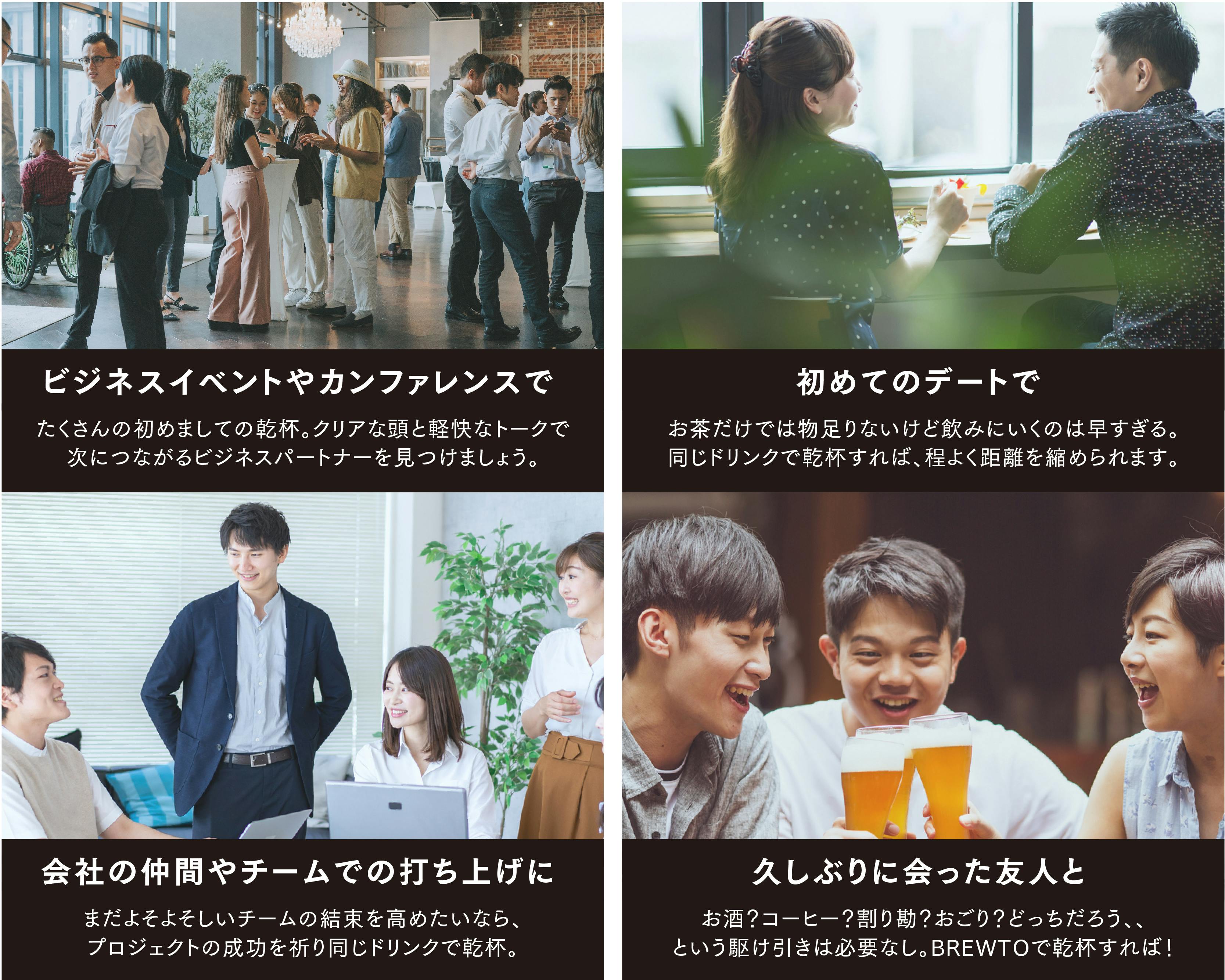 『BREWTO』は、乾杯が同じ飲みものであることにこだわっています。あなたと私は違う。でも、だからこそ、知り合うおもしろさがあるし、共通点を見つける楽しみがあります。多くの人がおいしいと感じられるローアルコールなら、乾杯を盛り上げることができます。