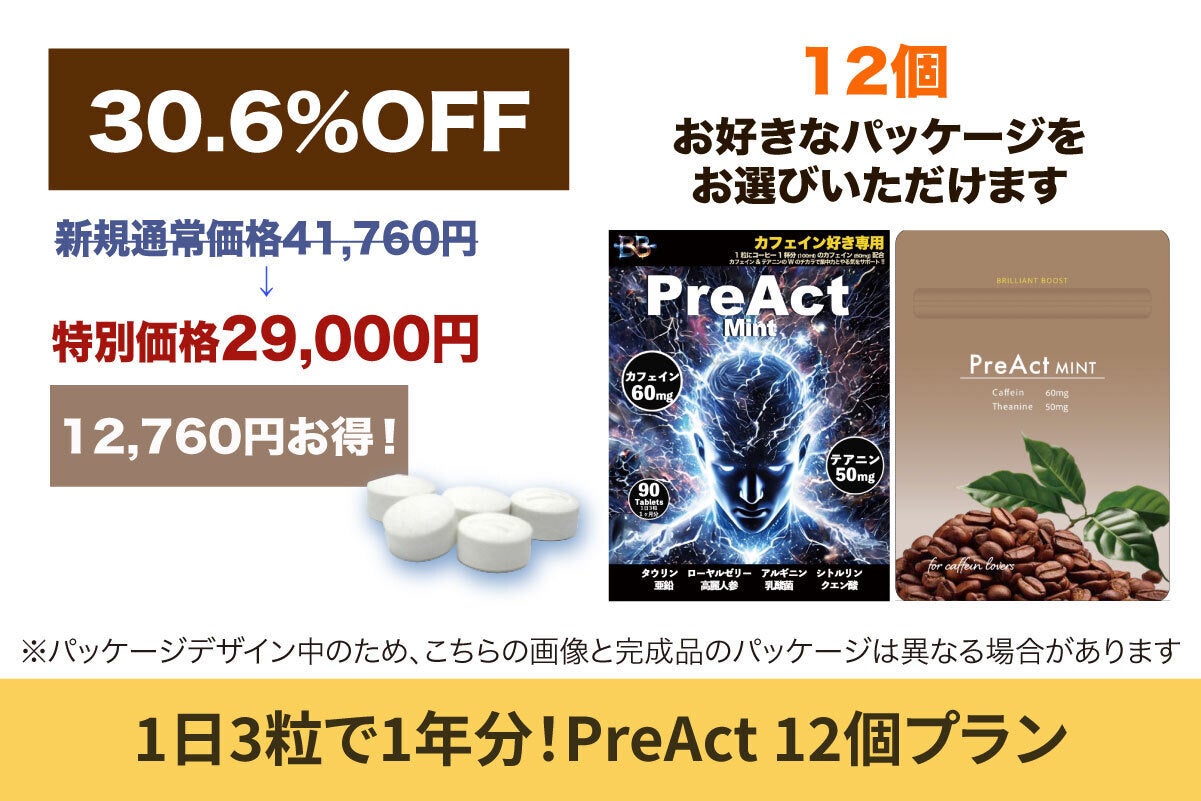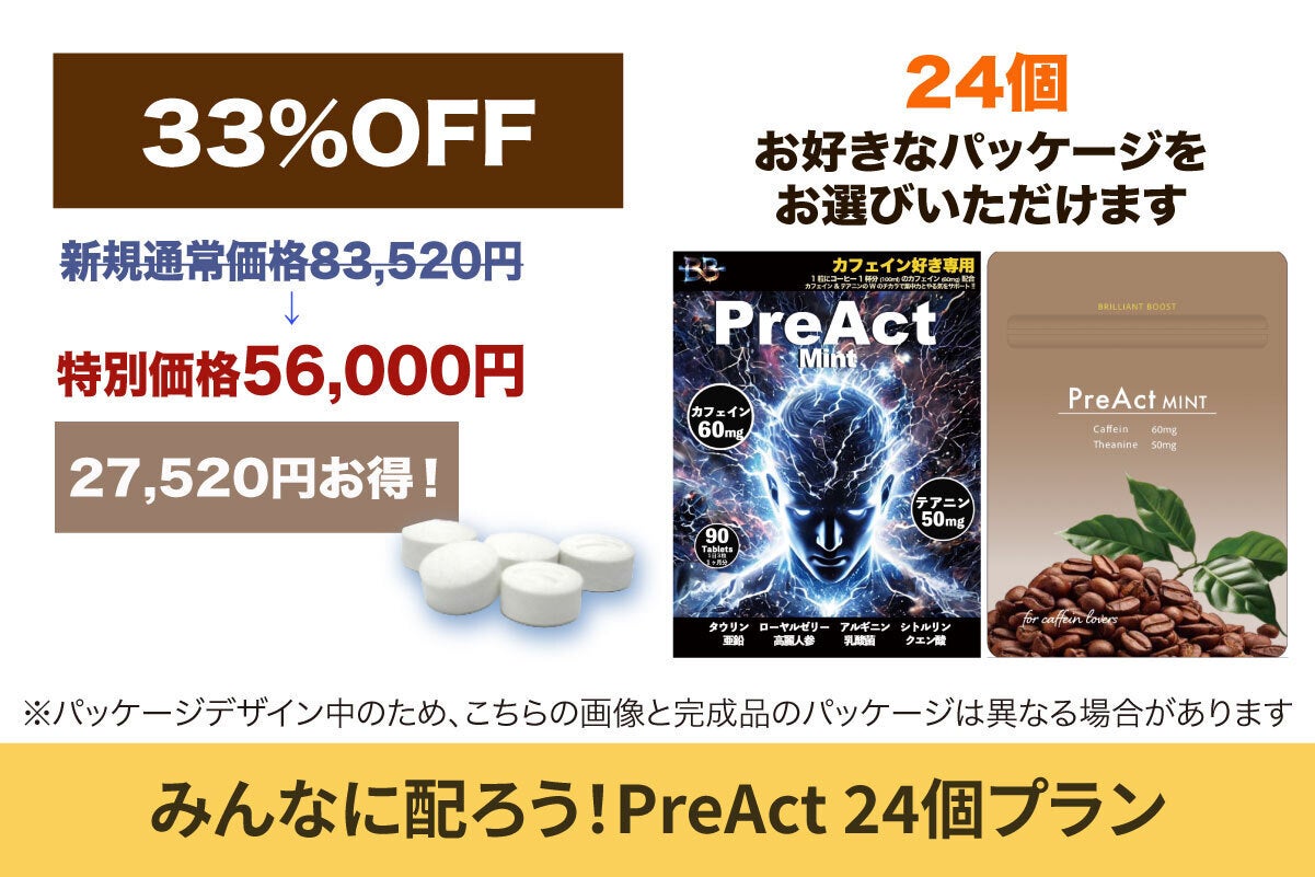 多彩なサプリメントの開発を計画していますが、第一弾は今頑張っている方々をすぐにサポートできるようカフェインサプリ【PreAct(プレアクト)】に決定しました。