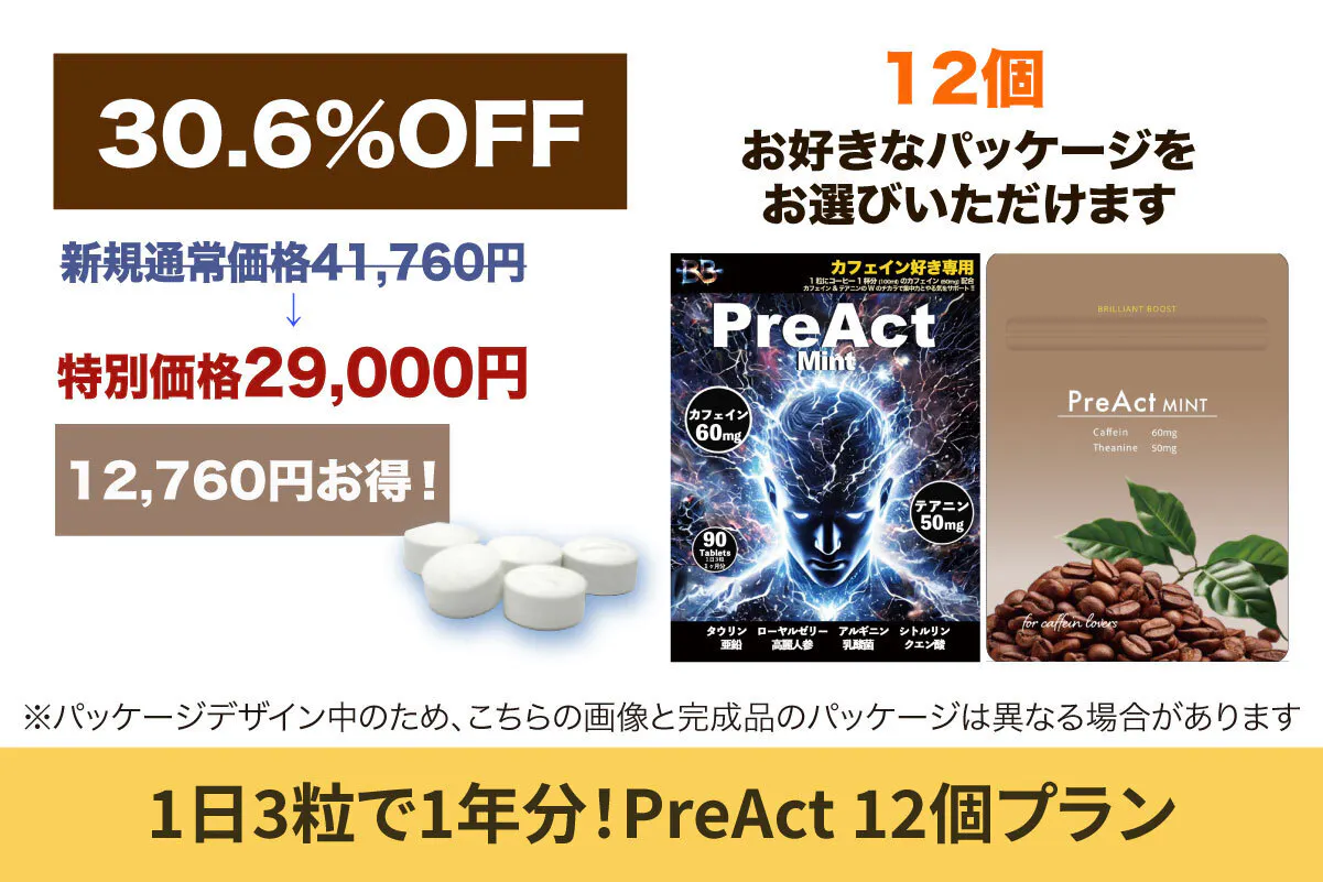 ●カフェインサプリ「PreAct(プレアクト)」12個をお届けします。