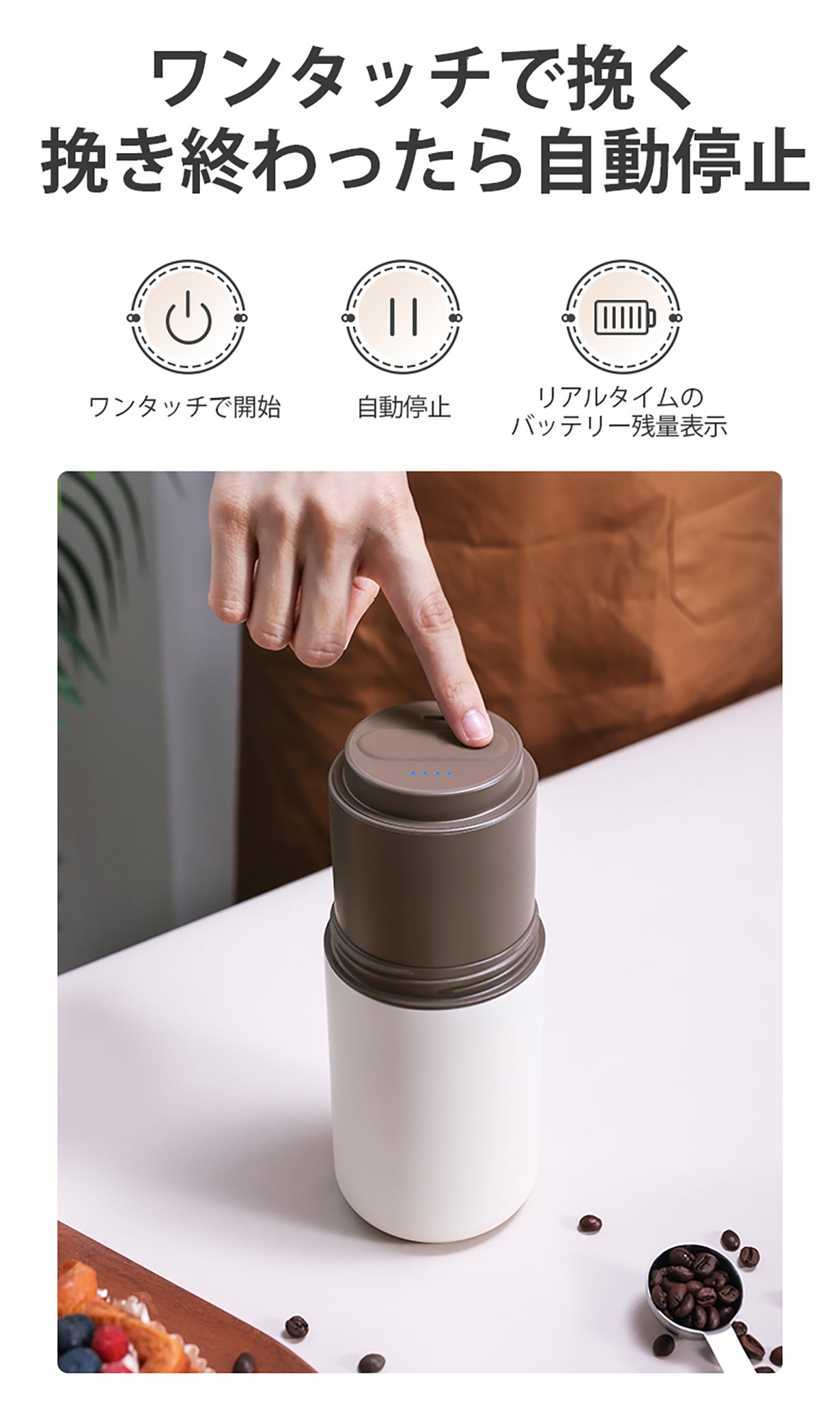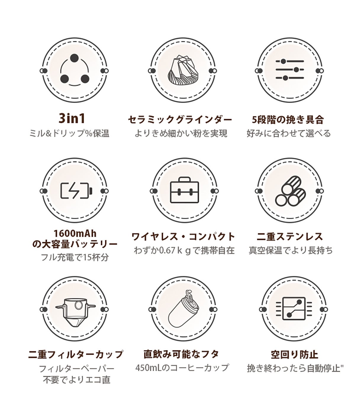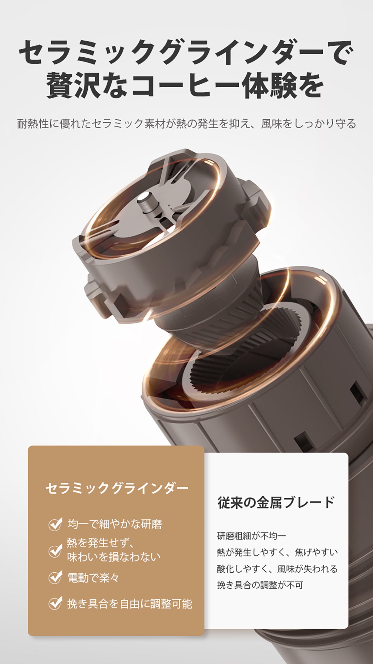 高品質のセラミックグラインダーを採用し、優れた耐熱性でコーヒー豆本来の豊かな風味と香りをしっかり守ります。毎日のコーヒータイムが、まるでプロのバリスタが淹れたような贅沢なひとときに変わります。極上のコーヒー体験をお楽しみください!