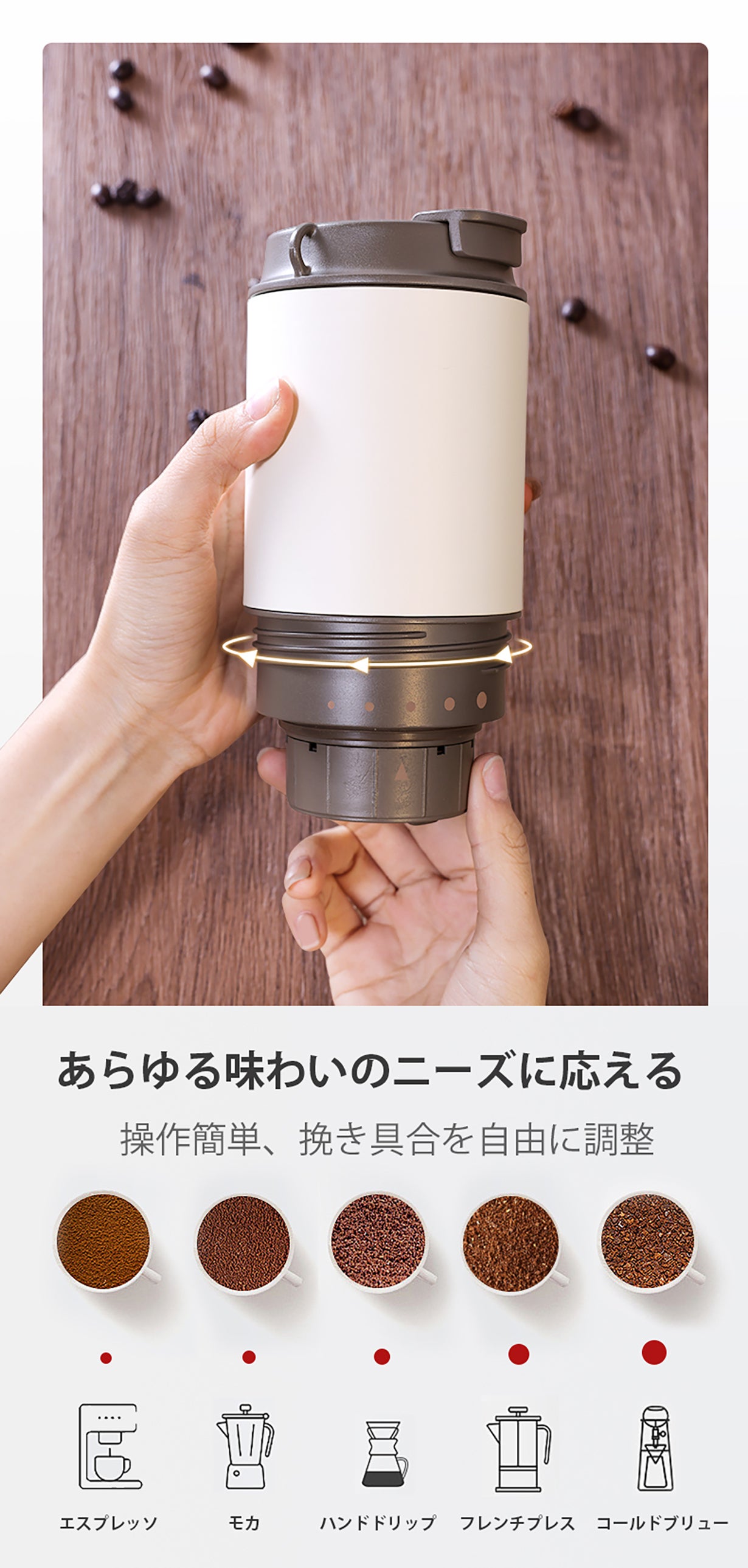 特に高品質なセラミックグラインダーや、便利な五段階の粗さ調節機能など、ユーザーのニーズに応えた仕様となっています。私たちの製品を通じて、お客様が毎日のコーヒータイムをさらに楽しんでいただけることを心から願っています。