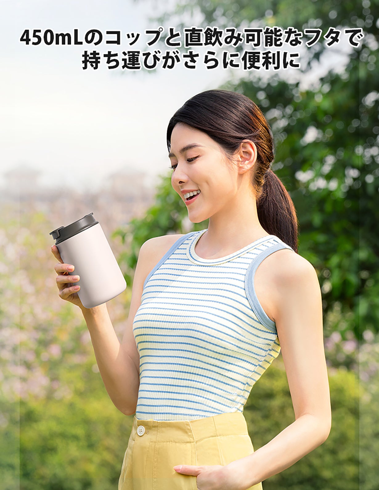 450mLの容量と直飲み可能なフタで、持ち運びがさらに便利に!手提げ用の穴が付いているので、お気に入りのストラップを取り付けて、スタイリッシュに持ち運べます。これで、どこに行ってもおしゃれにコーヒーを楽しめます!