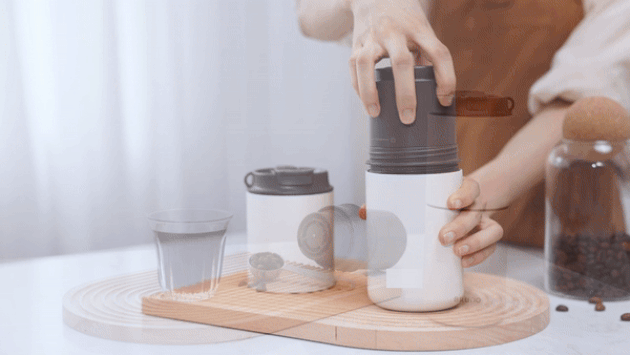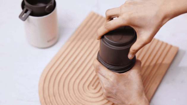 お好みのコーヒー豆を入れます(350mlのコーヒーには15gのコーヒー豆が推奨されます)。その後、グラインダーの蓋を締めます。