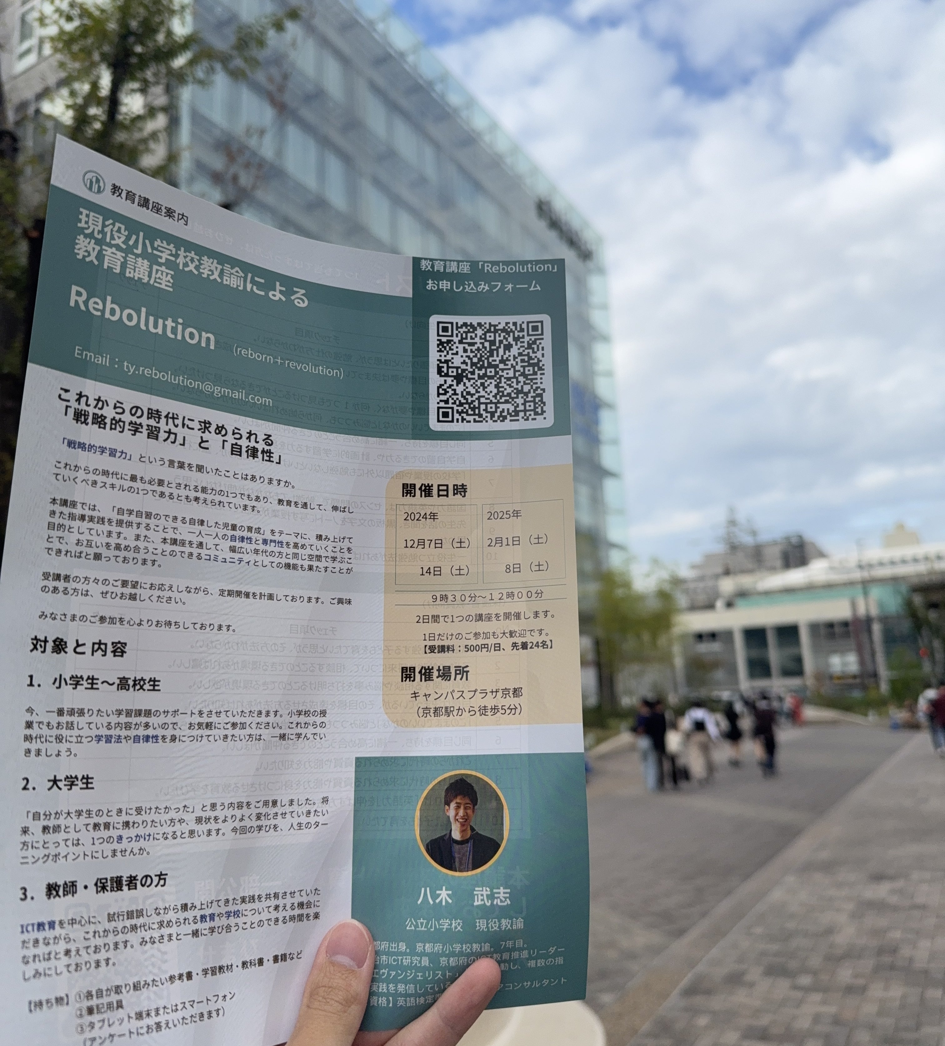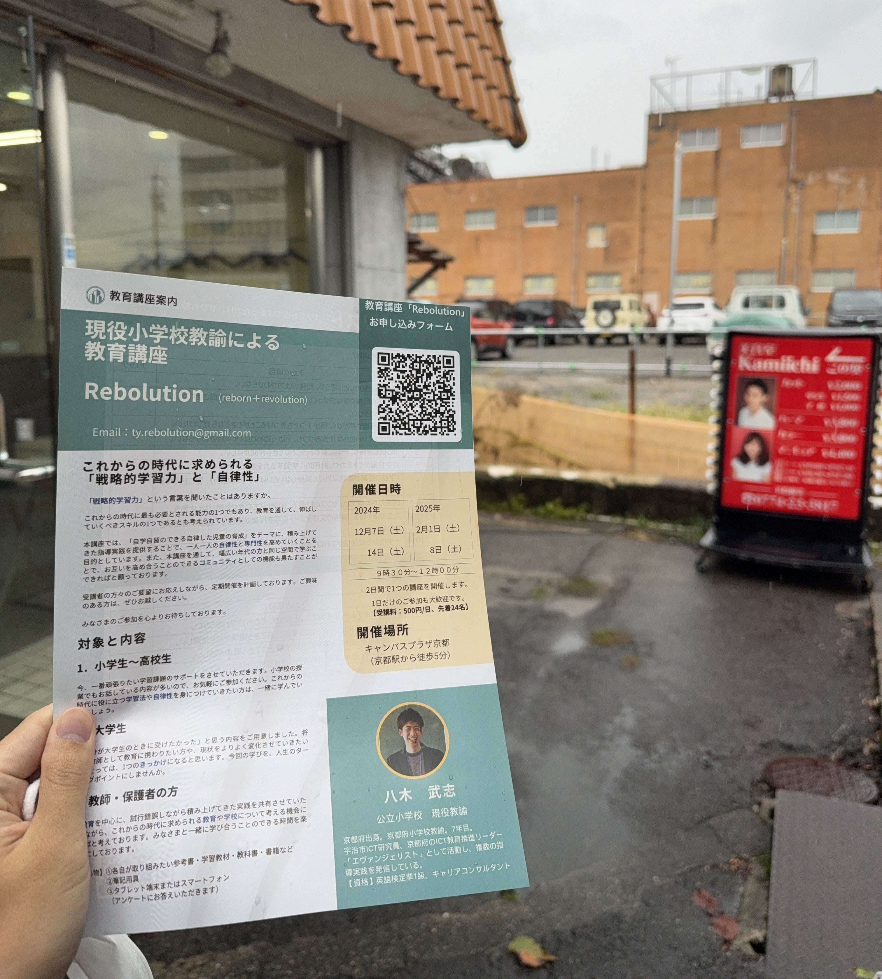 株式会社京進スクール・ワン京都駅前教室様のご協力により、フライヤーを配付していただくことになりました。私は学生時代に、別の教室で講師としてお世話になっておりました。今回の取り組みに関心をもってくださり、今後、保護者の方々と面談をされる際に、お一人ずつ、フライヤーを手渡ししてくださるそうです。本当にありがとうございます。一教諭として、担任をさせていただいていると、時々、目の前の子どもたちにとって、何が正解なのか、分からなくなるときがあります。考えても、考えても、考えても、答えが出ないこともあります。一方で、確かなこともあります。それは、これまで受け持たせていただいた子どもたちが、毎年、期待以上に大きく成長してくれることです。初めて出会う4月の頃よりも、大きく、逞しく、自律した姿を3月には見せてくれて、本当に嬉しく思います。こんな姿を見せてくれると、これまで取り組んできたことは、少なくとも、間違ってはいなかったように思えます。今回の講座内容は、今までにない切り口になるかもしれません。それでも、お役に立てるなら、1人でも多くの方にお届けすることができるように、精一杯、尽力してまいります。ご協力いただき、ありがとうございます。引き続き、よろしくお願いいたします。