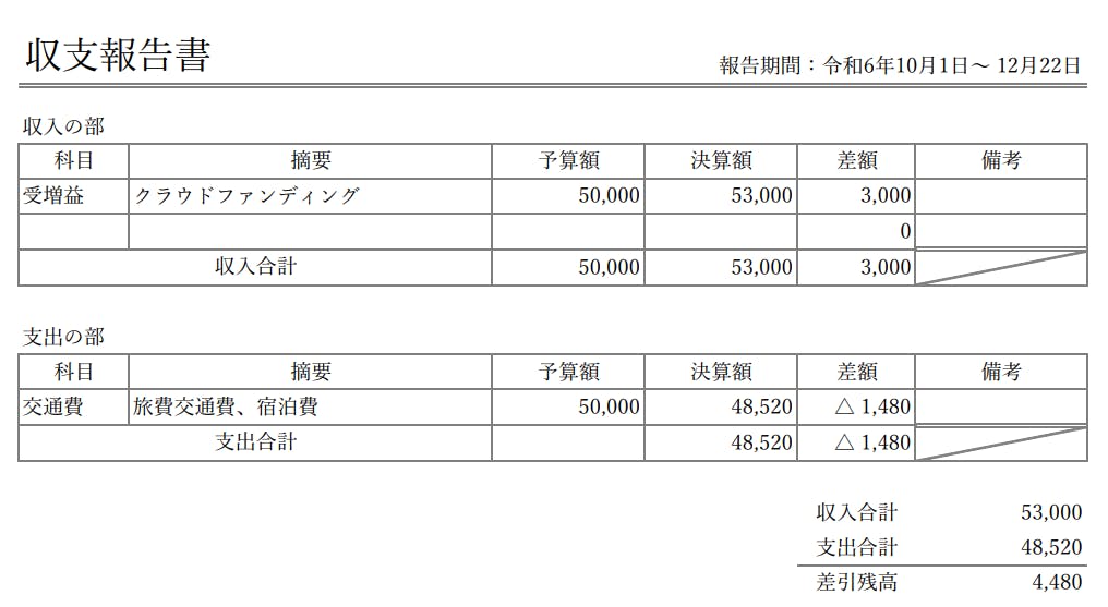 皆様より沢山のご支援をいただいた結果、53,000円もの支援金が集まりました。このうち、48,520円を学生の遠征費用にあてさせていただきました。