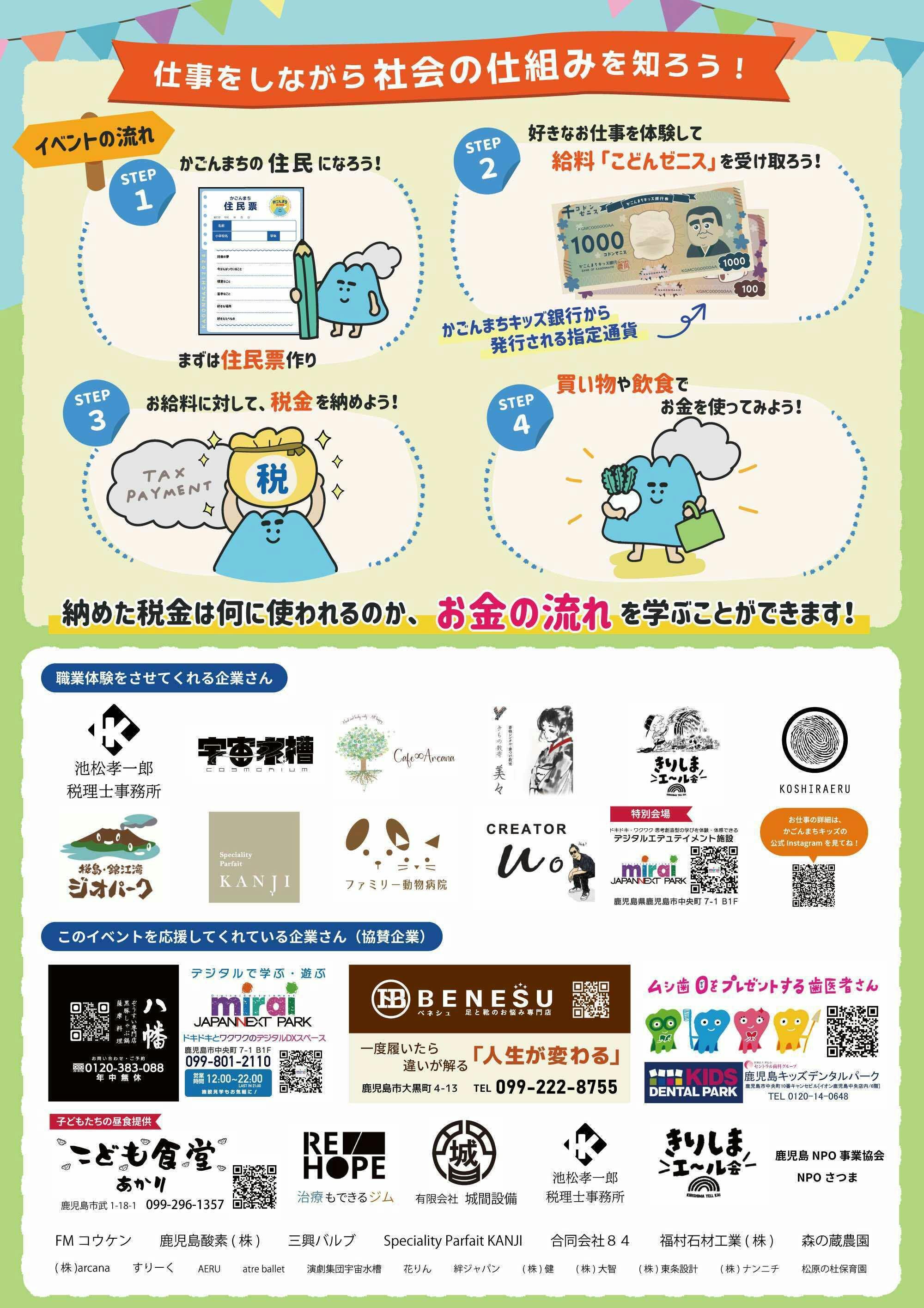2024/11/21 23:21皆さまのご協力をいただきながら準備を進めてまいりました職業体験イベント「子どもが考えかがやくまち かごんまち」の開催がいよいよ近づいてまいりました。この場をお借りして、改めて心より御礼申し上げます。開催概要日時: 11月23日(土)時間: 10:00~16:30場所: 鹿児島県青少年会館イベントでは、子どもたちが自ら考え、挑戦することで、さまざまな職業について楽しく学べる体験ブースを多数ご用意しています。未来を担う子どもたちの一生懸命な姿や新たな発見にあふれる様子を、ぜひ見学にお越しいただければ幸いです。昨日の最終ミーティングも終わり、明日準備日となります。ドキドキしながら、ワクワクしております!皆さまの温かいご支援とご協力により、素晴らしい一日となるよう、引き続き準備に努めてまいります。当日お会いできますことを心より楽しみにしております。 もっと見る