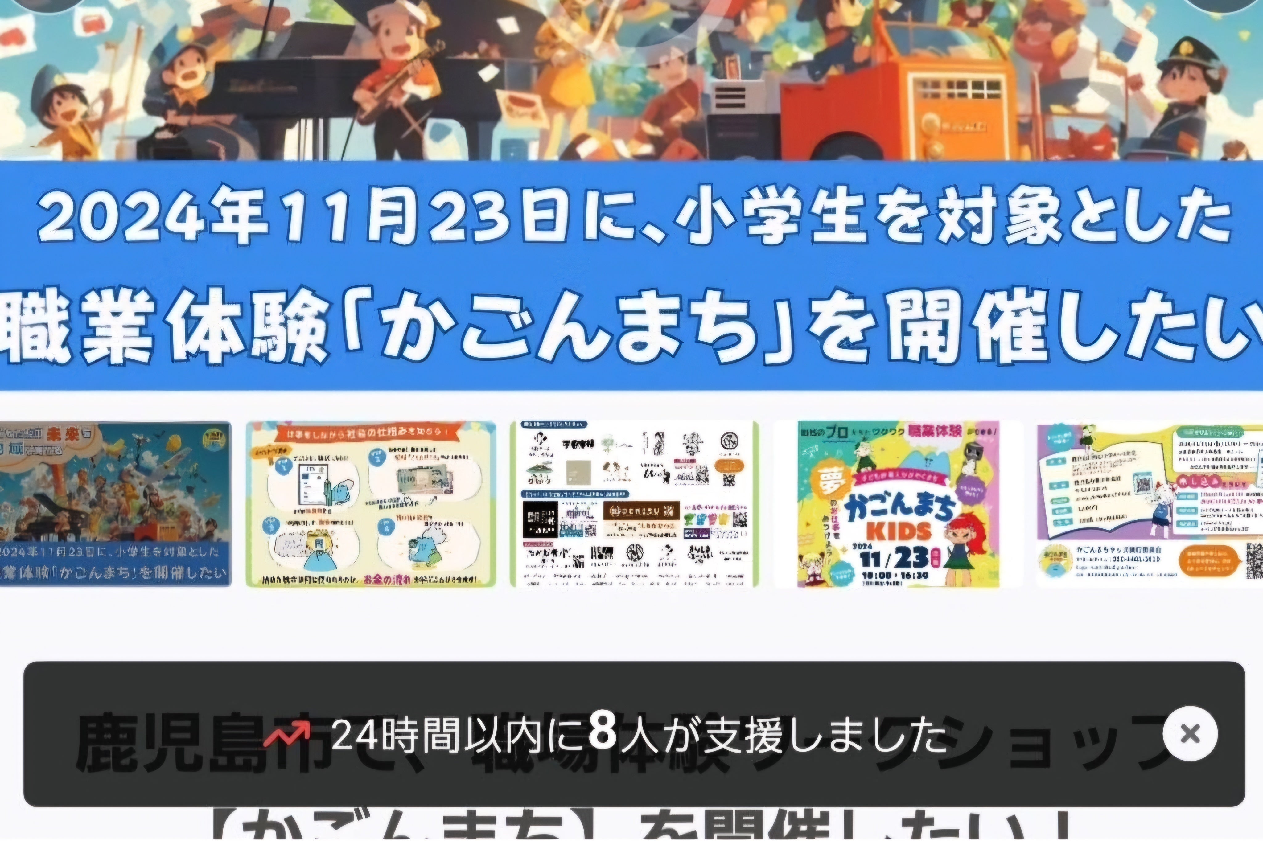 ご支援いただいた皆さまへ このたびは、私たちのプロジェクト「子どもが考えかがやくまち かごんまち」に温かいご支援をいただき、本当にありがとうございました。 皆さまのお力添えのおかげで、無事にイベントを開催することができました。当日は、多くの子どもたちが参加し、笑顔が絶えない素晴らしい時間を過ごすことができました。子どもたちが自ら考え、挑戦し、輝く姿に感動し、改めて皆さまのご支援の大きさを感じています。 今回のイベントが成功したのは、支援者の皆さまのおかげです。心より感謝申し上げます。 今後とも地域や子どもたちが輝ける場をつくるため、活動を続けてまいります。また次の機会がございましたら、ぜひ応援していただければ幸いです。 本当にありがとうございました!