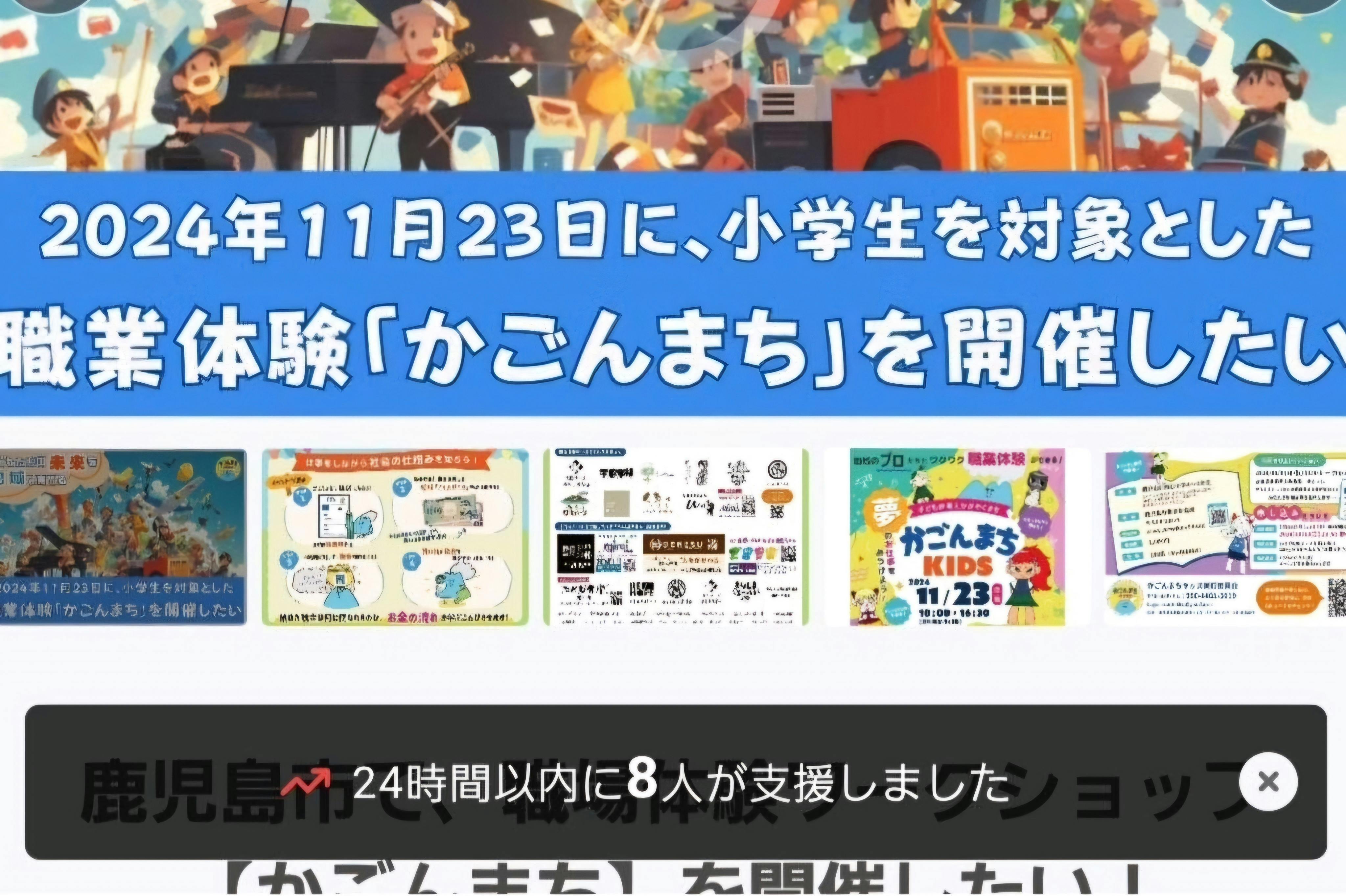 2024年11月23日、鹿児島市で小学4~6年生を対象とした職業体験ワークショップ「かごんまち」を開催します!地元企業が協力し多彩な体験ブースを展開します。私たちはこの取り組みを今回だけでなく継続的に開催していきたいと考えています。ぜひ、あなたのご支援で子どもたちの夢を応援していただけませんか?